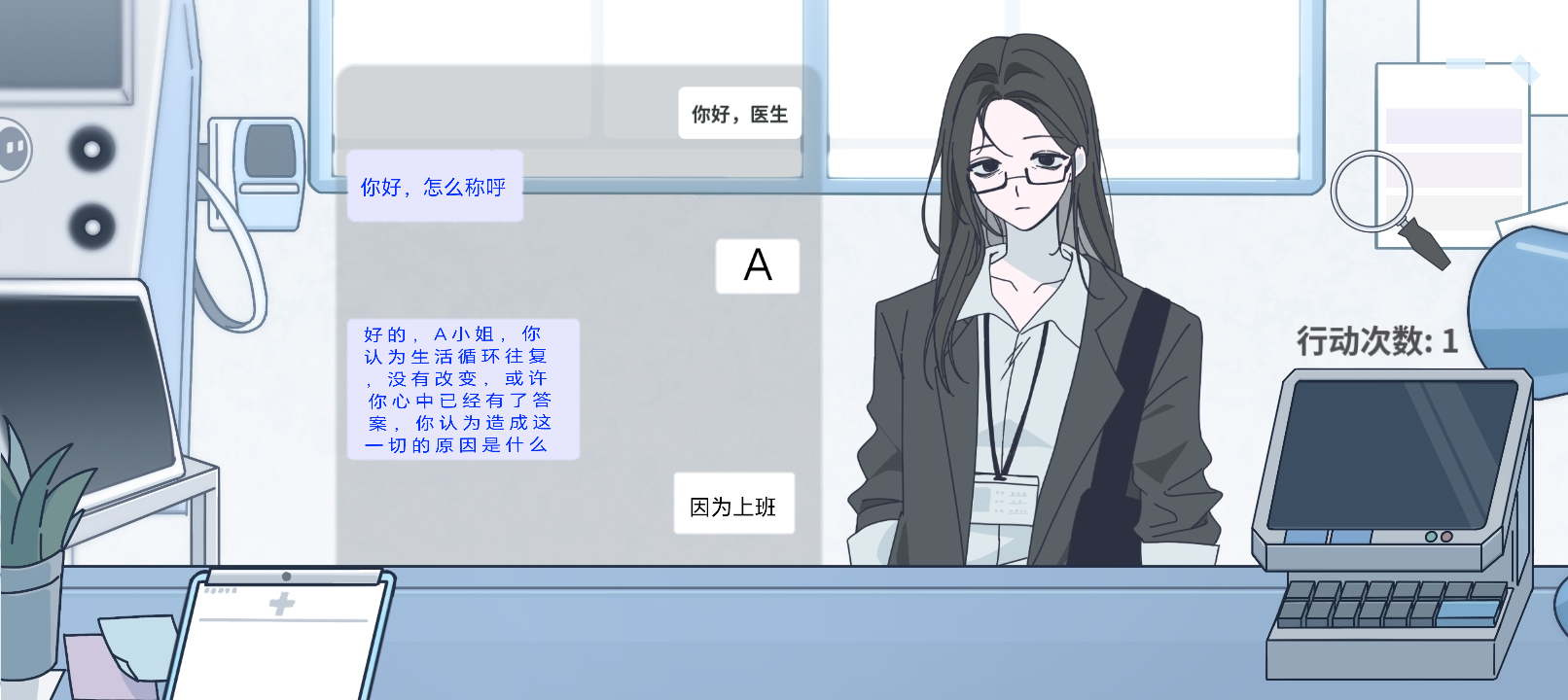 又征求了朋友的意见,她觉得对话诓有些怪,不像线下面对面的医疗而是线上微信/QQ聊天的样子(我的语言形容没救了)常见的对话框一般都是在角色下方,像这种的到是头一回见,也算特点吧