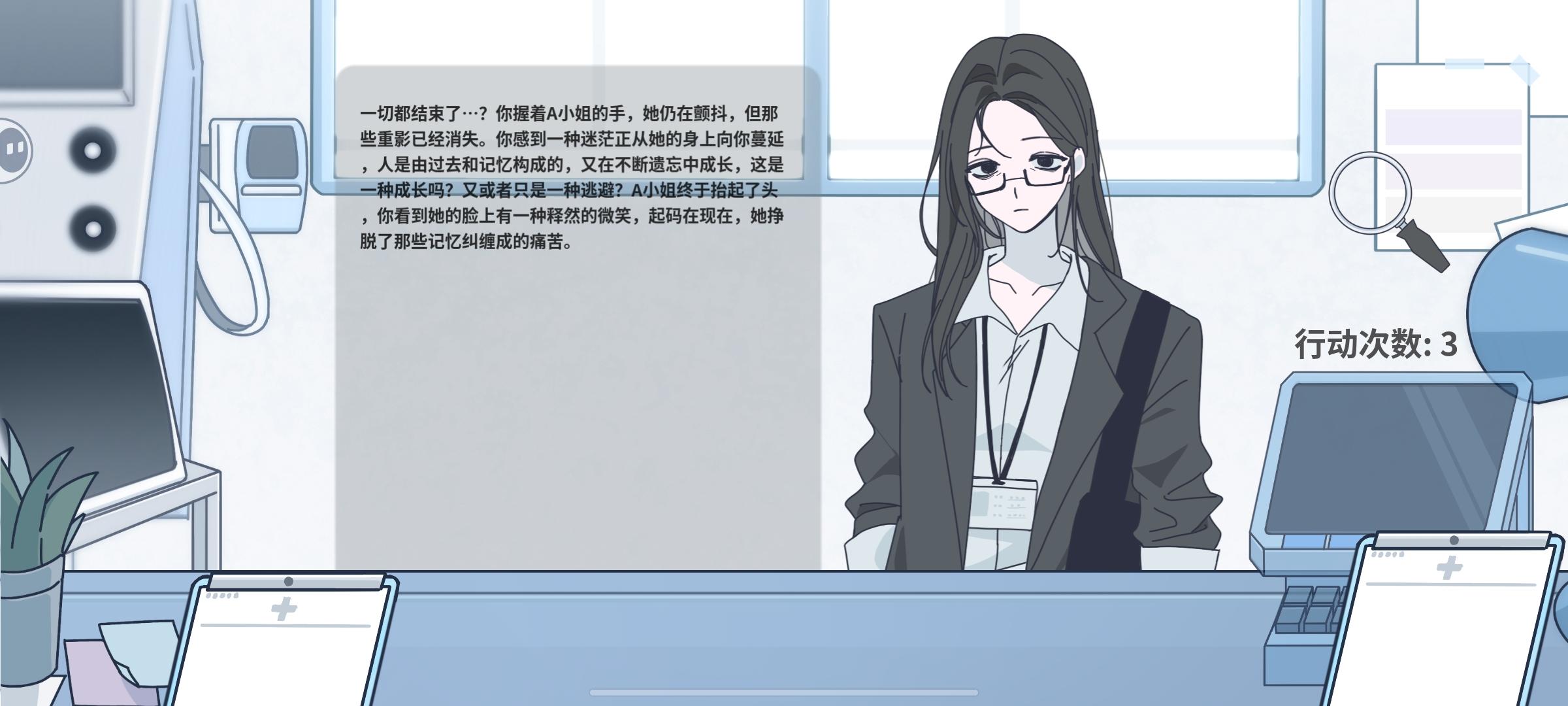 想法创意很好,画风个人很喜欢,剧情内容比较有意思就是太短了,还有治疗的那个部分,或许可以再改善一下,是bug还是什么原因一些图点一下就呃…飞了(语言贫脊不知道怎么形容)然后治疗就结束就进入循环了,文字描述地方较多,制作组有精力的情况可以将一部分文字绘成画面,还有结局可以多添几个,以及游戏内选项少,自由度太低,对于A小姐的一些话没了解明白,为什么急于否认自己的黑眼圈?从官方发的A小姐立绘右上角提到的细节中有黑眼圈这一特点,为什么A小姐会解释成眼影?A小姐突然提到象的故事是想表达些东西吧,但我没看懂,然后对于A小姐的工作,我不是特别的了解,但剪辑师这份工作应该要一定的功底吧,纯小白自学进公司个人感觉不可能,所以A小姐的大学专业跟剪辑多少会有些关系吧,那么当初的A小姐是喜欢剪辑的吧?(或是家庭上父母强迫学这个专业?以上均个人猜想,没有任何权威依据提供可能性,请勿当真<(_ _)>)