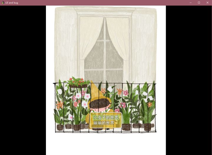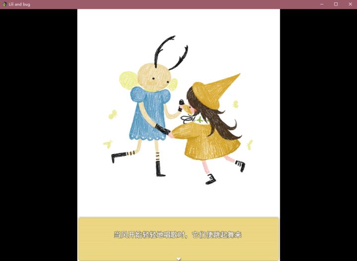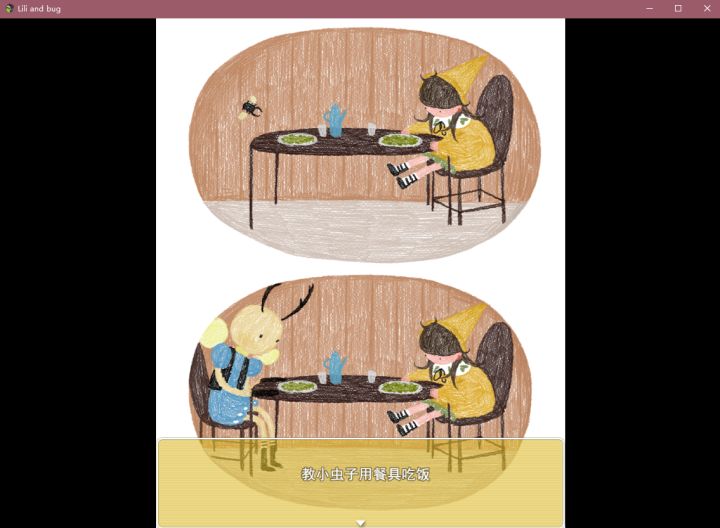 2D画面效果有点像蜡笔画,色彩比较丰富,界面结构简单,UI和功能都非常少。从UI看出似乎是拿RM做的,只是没用到那些功能。小女孩形象可爱讨喜,小虫子也有拟人化的形象,虽然都是静态图片,但却栩栩如生,能展开很多联想,脑补空间大。