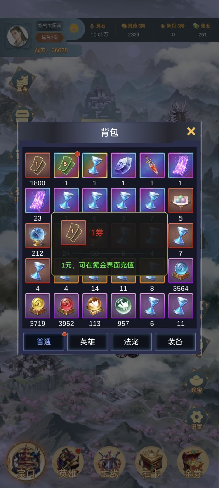 我这个时长,中间跨了一天,查了下储计,用了2.3W券,背包里沙漏一堆,其实到后面是缺突破符和灵草炼丹。