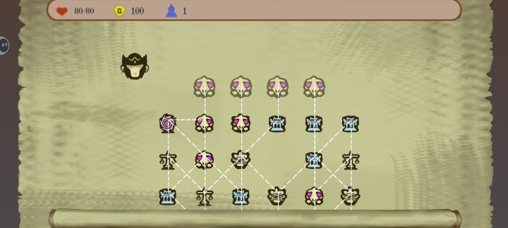 以关卡制进行游戏,从界面看应该还想做不同的英雄及差异化。关卡地图是树状结构线路,与常规单机独游设定很接近,但线路方面有一些自由度,可以重复打一只怪,也可以走回头路,并不是一条线走到黑。与同类游戏一样,单局游戏时间比较长。