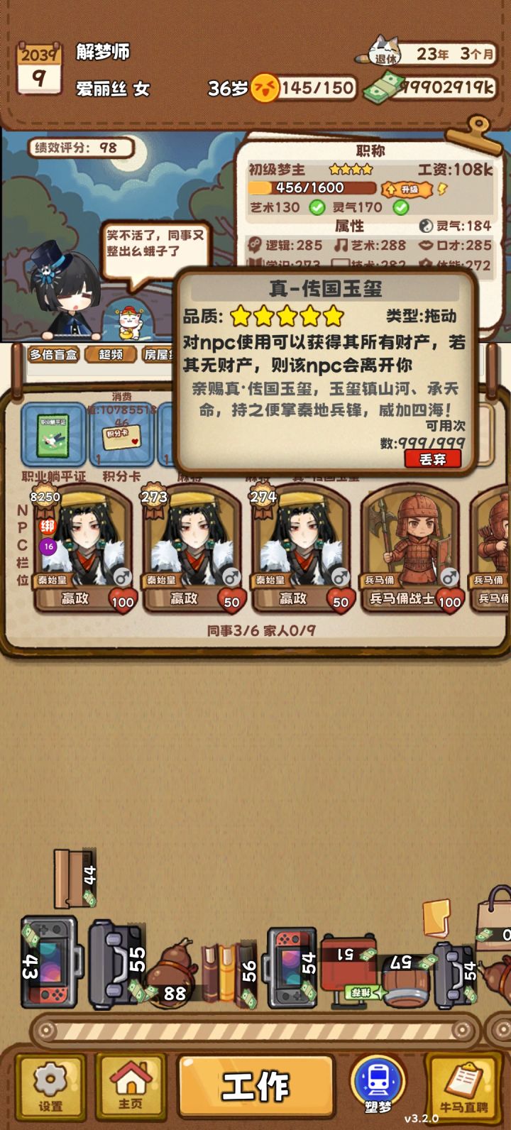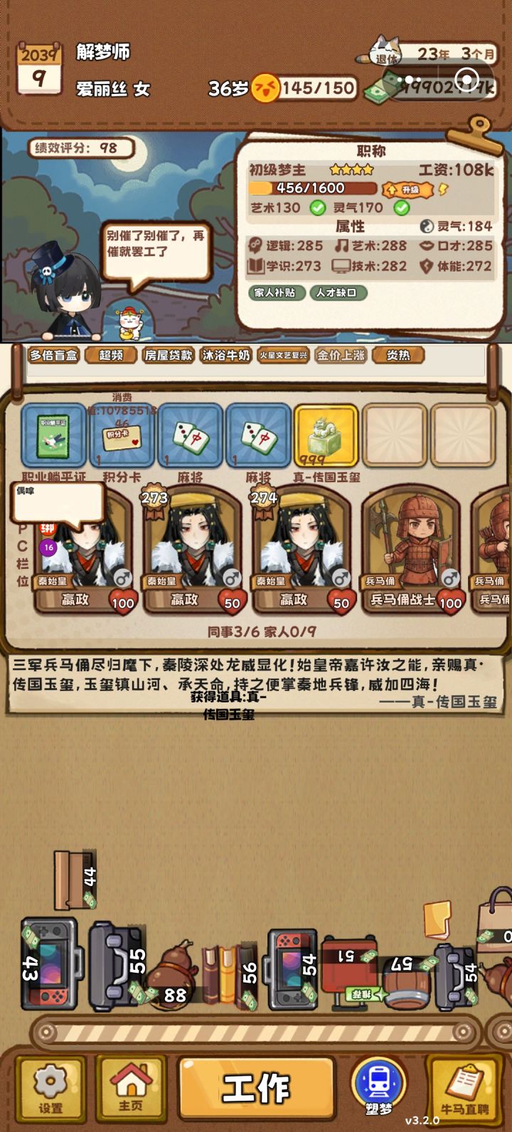 1.你一句可攻略,我摩拳擦掌刷了不知道多少次商店才拿到钻戒,可惜看不到吸血鬼生的崽长大了()2.妈妈初始属性真的能刷出丈育3.不知道提升同事的属性有什么用…但是习惯性抓住就绑起来然后上个玩偶,有福同享啊有福同享4.关于体验的几个职业:黑客:技能是自己给自己涨薪jpg新加了绩效和失败概率,但是那可是加工资诶。就是得努力攒够20绩效才能开赌,不然已经涨的工资就失望地看着你然后流走了金融:刷好