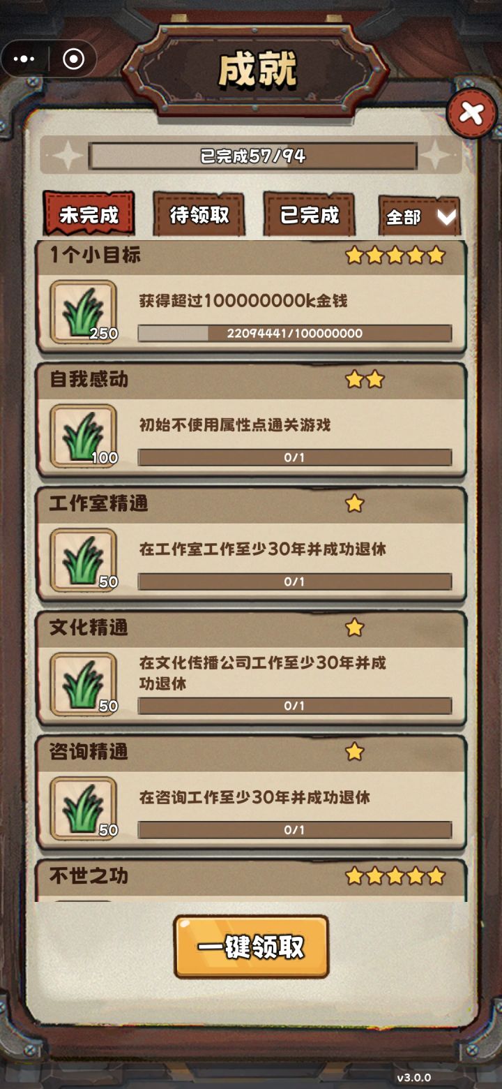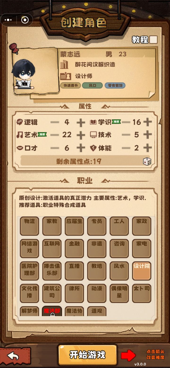 开局先结婚刷家人,同时走设计路线加属性,钱够用就行,选便签纸➕牛马秘籍组合快速刷经验,记得锁一个最低级的工作(每次),我这边是400经验升级那种,升迁可以五次,升级要二十次,家人同事在跳槽的时候凑满了,然后不停地换放大镜,我最后是四个金两个普通放大镜