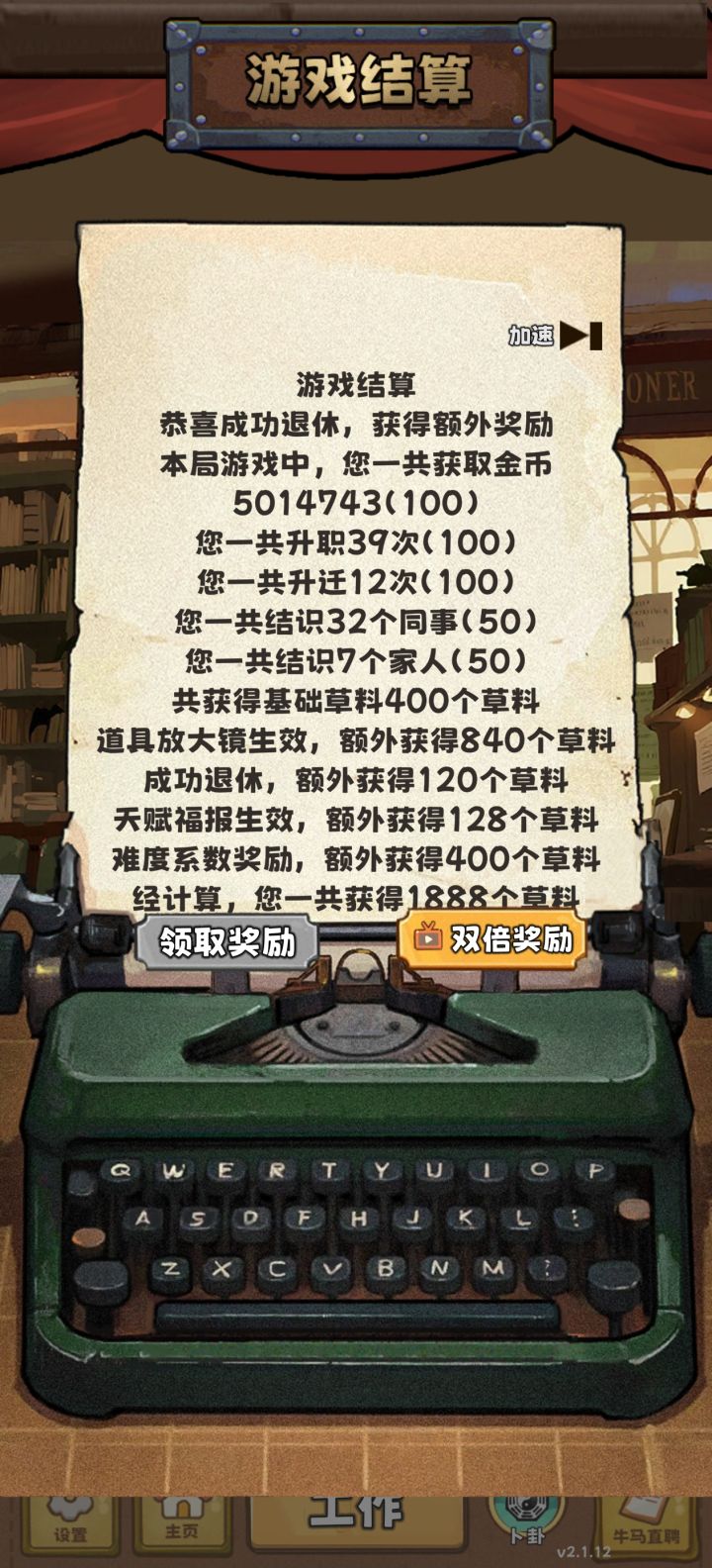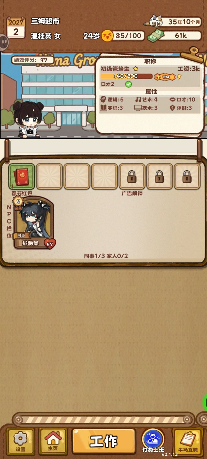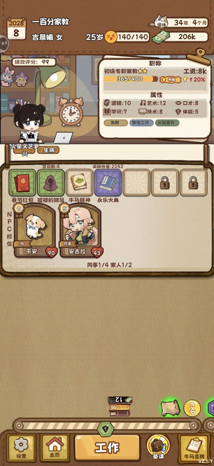 开局先结婚刷家人,同时走设计路线加属性,钱够用就行,选便签纸➕牛马秘籍组合快速刷经验,记得锁一个最低级的工作(每次),我这边是400经验升级那种,升迁可以五次,升级要二十次,家人同事在跳槽的时候凑满了,然后不停地换放大镜,我最后是四个金两个普通放大镜