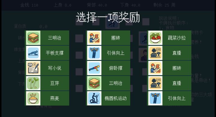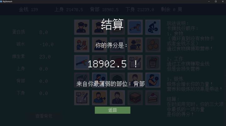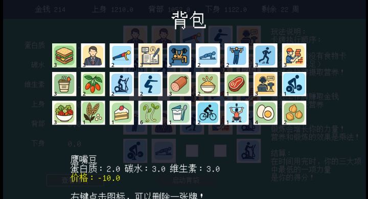 休闲策略游戏,只需要启动胃袋即可,会从背包中随机抽取卡牌排列在场上。左侧显示获得的属性和对应加成,在满足属性加成是正数的时候,上身、背部、下身属性才会得到增长,若是负数则会降低。以周为单位进行游戏,一周结束后可以三选一抽取卡牌,一堆卡牌五种随机出现,可以填充到背包内随机抽取,有少许选择策略。新手引导在右侧,对规则进行了说明,操作并未提及,实际只需点一个按钮即可启动游戏,没其他可操作内容,摸索下也能知道怎么玩。