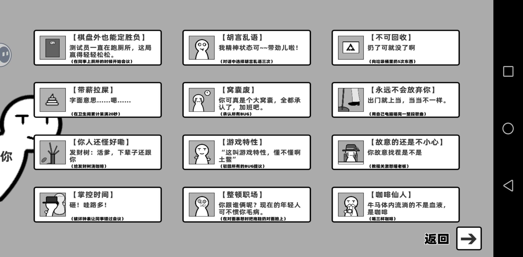 一款关于游戏测试员工的整蛊解密游戏,通过道具联想找到说服测试员工的答案,在测试问题中蒙混过关。游戏过关倒不是很难,难的地方在于部分成就。