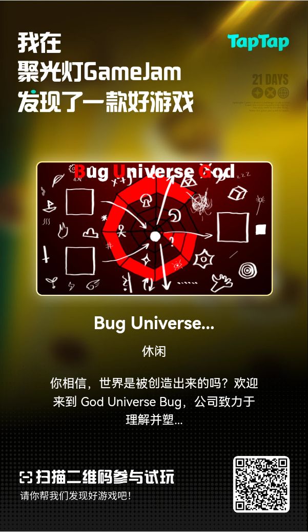 最后一篇日志,因为后续发生的什么都是意料之外的了。别的不说,直接上图:哈哈哈,就这样,没别的了。哦不对,还有这个,视频。啊哈哈哈,一切内容全爆了。啥都没剩了。哦?你问GoderBye是谁?存在以下Bug没有被修复:1.部分文字是错别字。2.进入关卡后迅速退出时。不能太水了!你相信,世界是被创造出来的吗?欢迎来到 God Universe Bug,公司致力于理解并塑造世界本征。