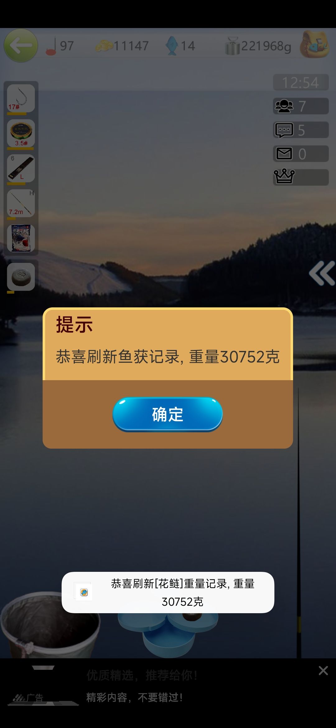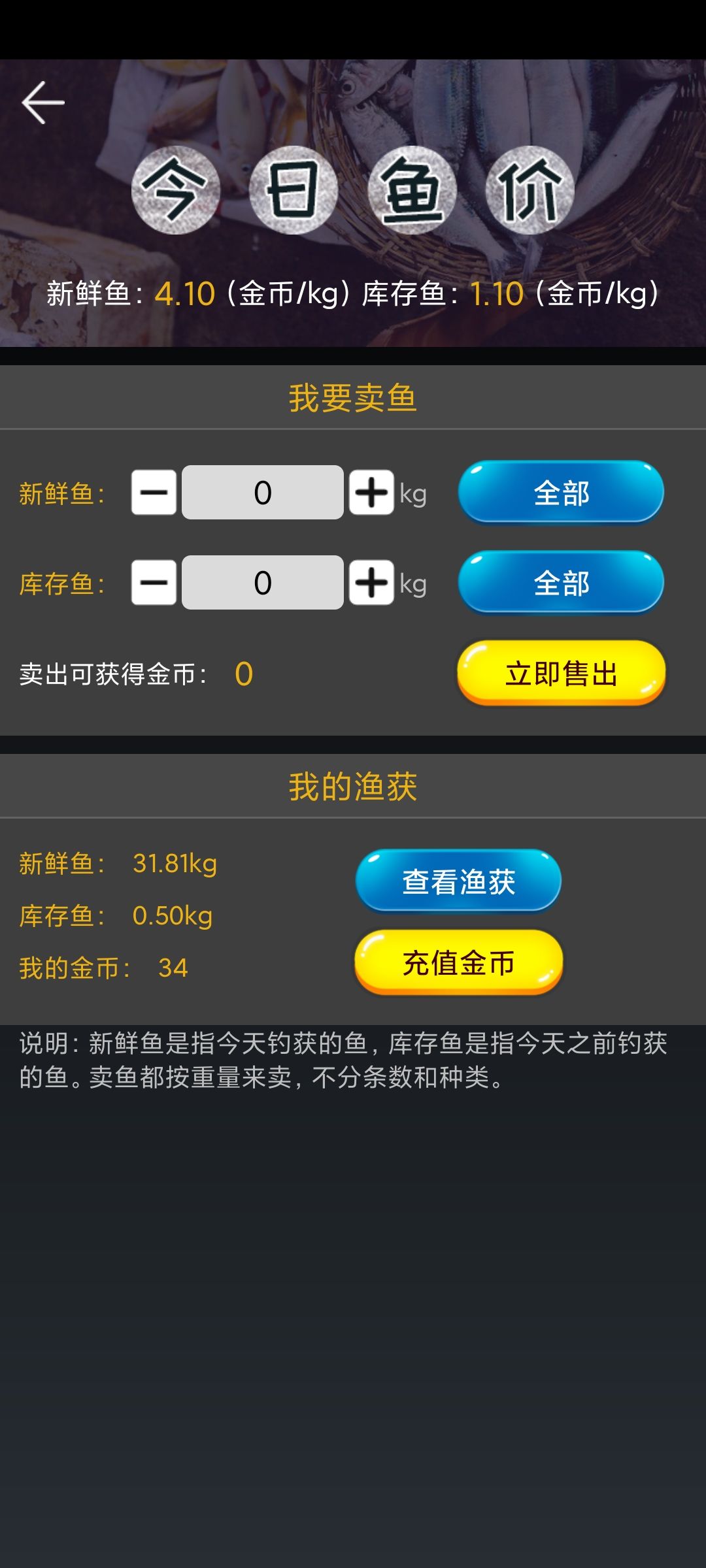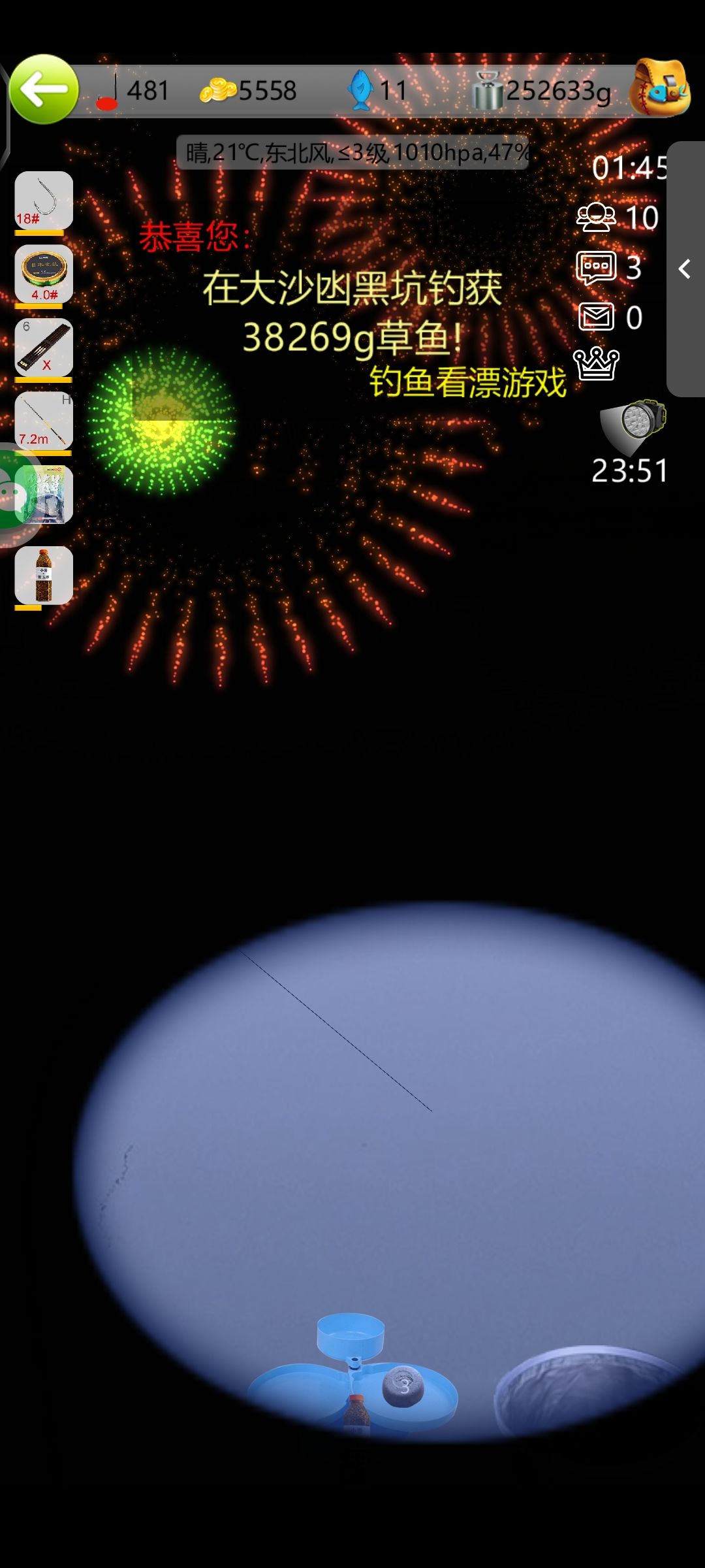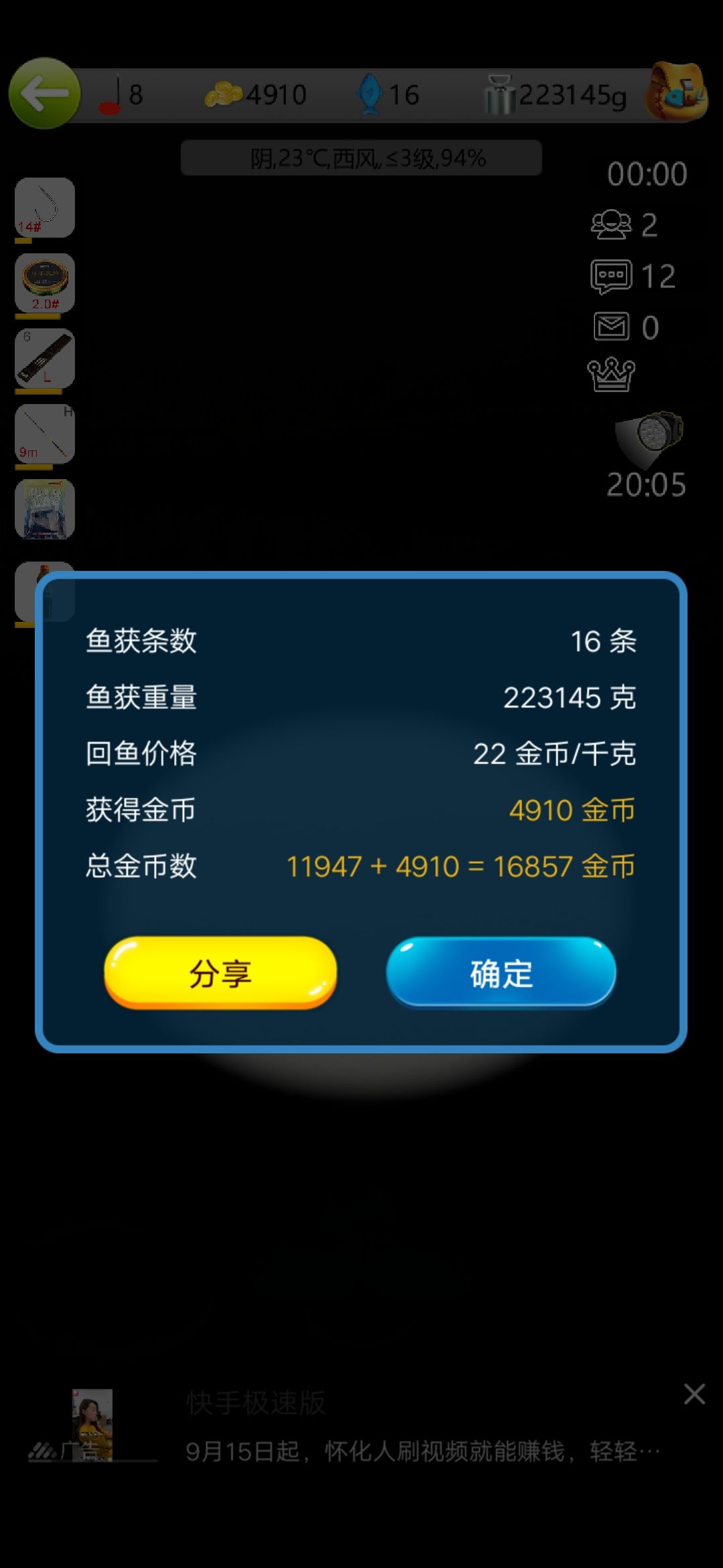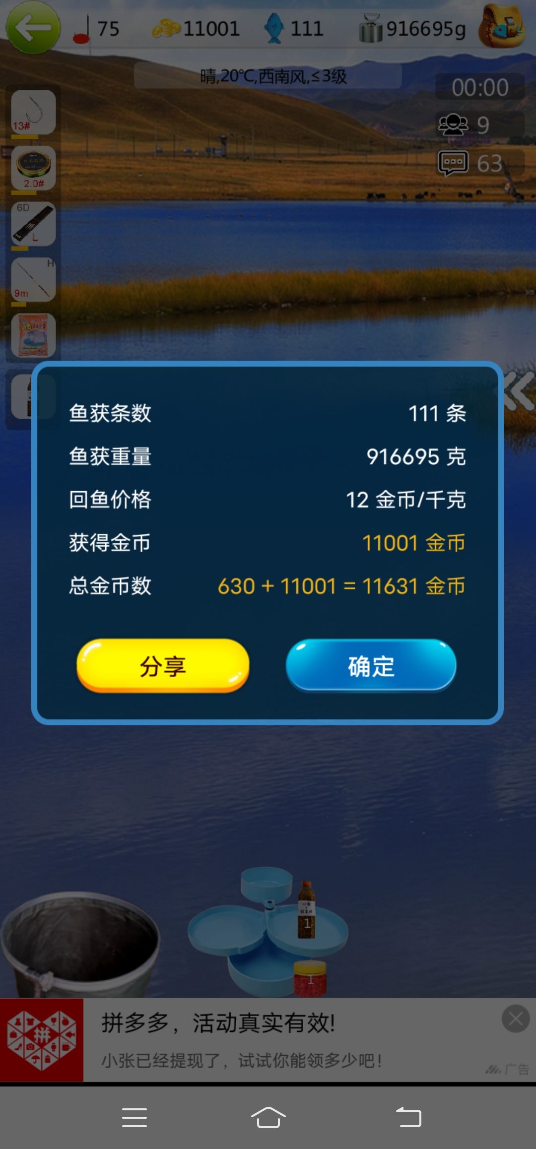 2、带上初始装备到咱们免费钓场先拉个400金币,(过程中跑掉的鱼记得看下提示,记住什么漂像是什么鱼,后面打黑坑用得上)