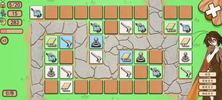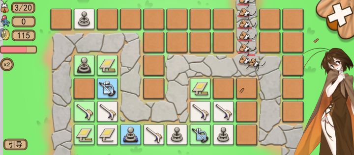 休闲塔防游戏,点击地块随机翻出不同种类炮塔,战斗开始后会自动攻击。开始前有限的行动次数可以移动或合成炮塔,每个炮塔每次仅限移动一格,一次行动会消耗1点行动点数,有使用分配策略。商店中也会出售炮塔,品级随机,购买需消耗金币。起点和终点不是唯一,三条线路都需要安排足够的防守力量。可以选择简单、精英和挑战三种难度关卡,总计20波,都挺下来才算过关。引导用一张图文说明,细节没交代清楚,十分简陋。