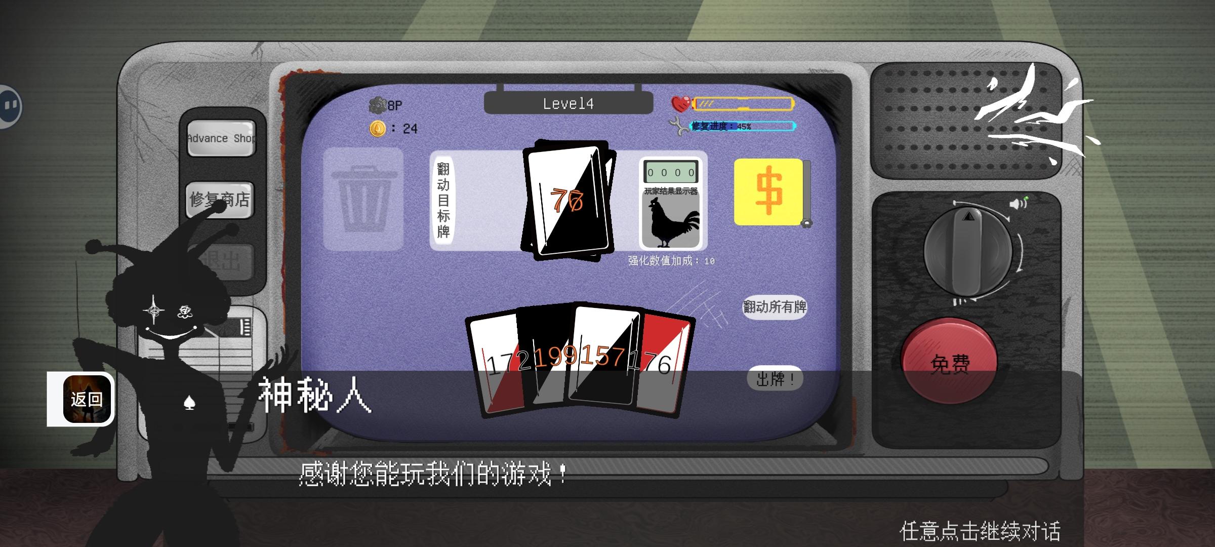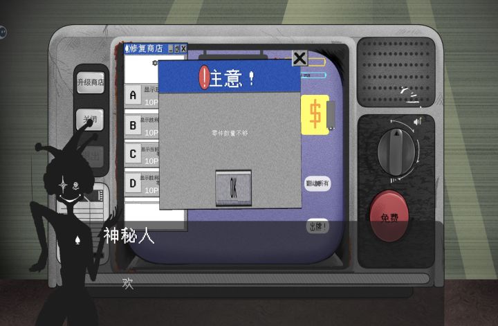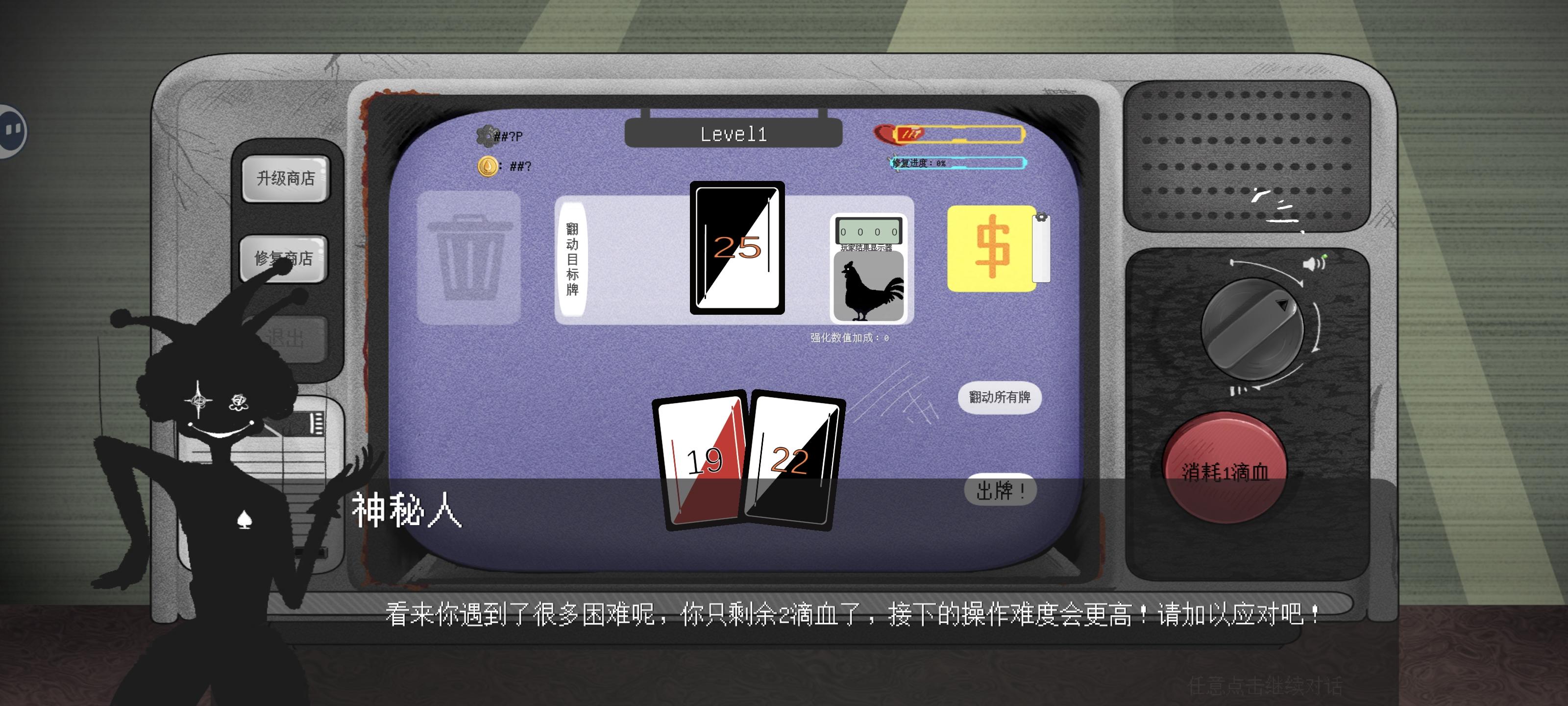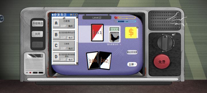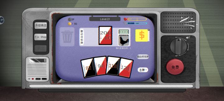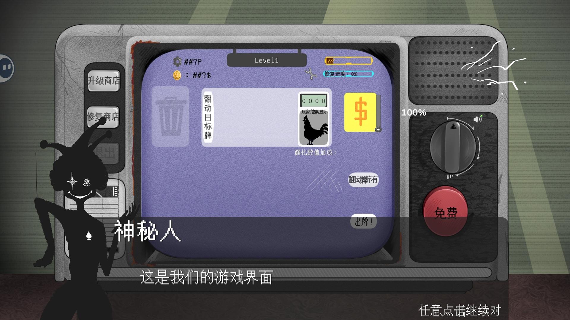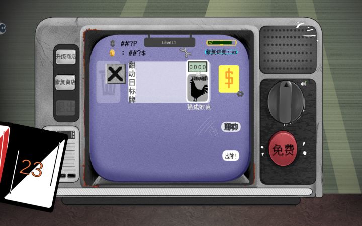 胜利后获得的金币和零件可以升级商店,让一些乱码的信息变得清晰。完全将电视机修复是最终目标,血量为0则游戏失败。引导部分介绍十分详细,全看完可以很快上手。