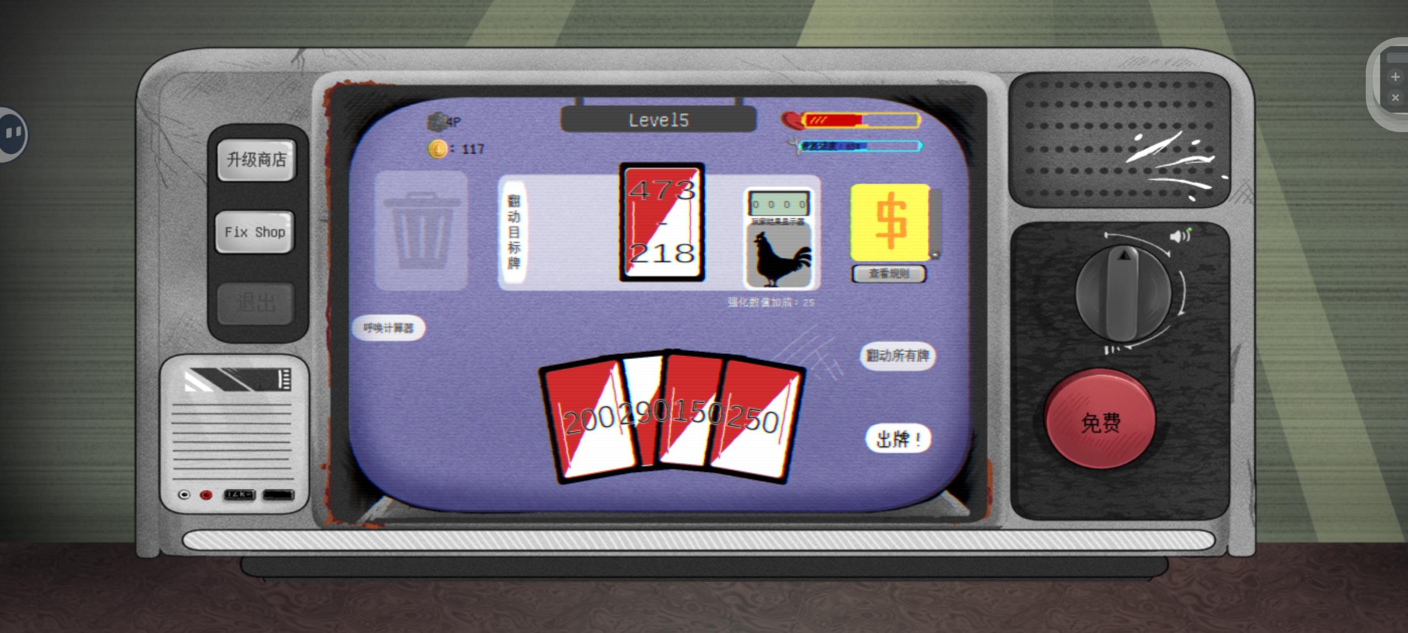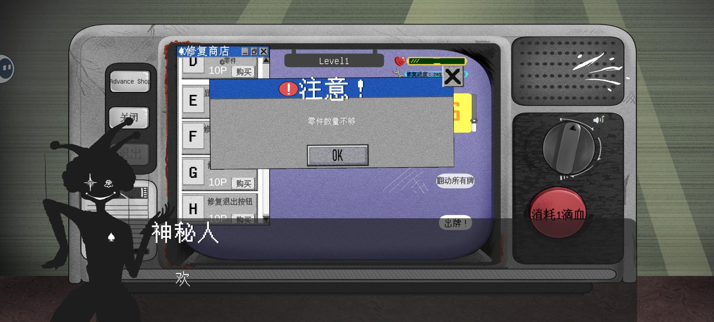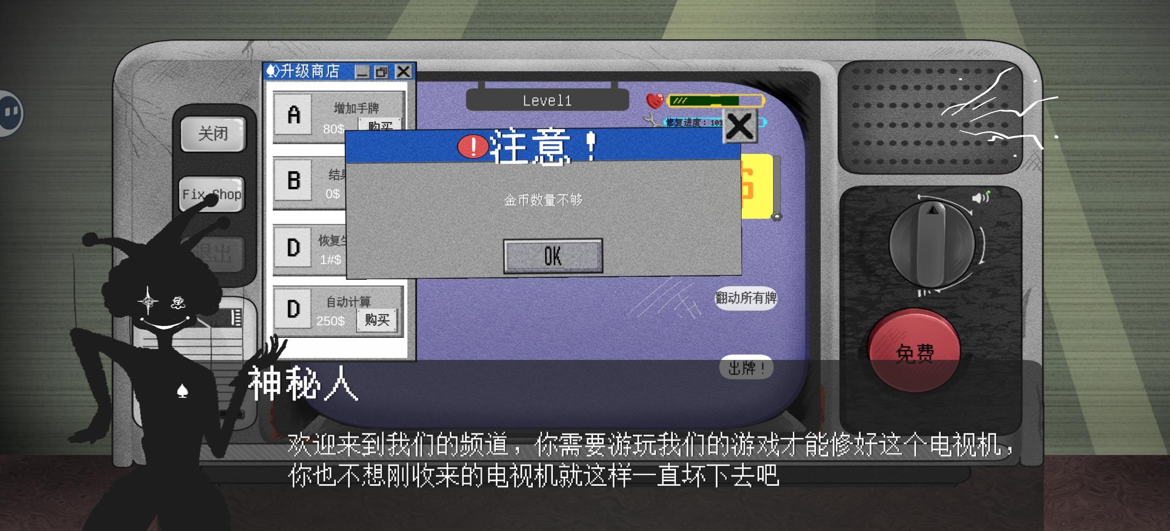 先修复了退出按钮,结果一局就结束了,难道不应该是类似于暂停一样,下次进去在继续退出之前的牌局么?还有新开一局先按了免费,在按别的他就卡在那了,最后能不能加个跳过教程啊,贼烦每次开局都要讲一遍