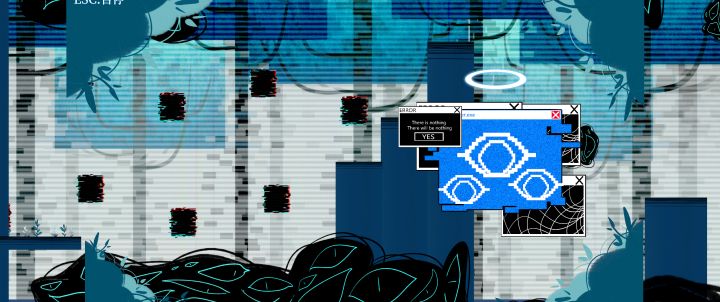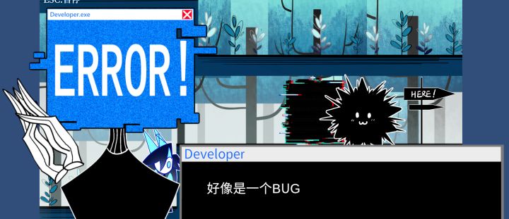 2D卡通画风,界面透着一种有BUG的诡异感,黑框的位置很明显,能藏主角的设定很新奇,整体表现效果很好。旁白作者像是个显示器人,游戏主角看起来像女性,带有少许魔幻风格特点,有简单的行走跳跃和躲避动作。特效意思表达准确,理解很容易。
