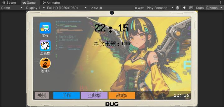今天已经是day6了,在经历了4天思考设计,2天全力拼接UI后,终于是将游戏电脑页面场景拼完了,虽然代码还一个字未动,但单人solo这进度已经很满意了。而已知聚光灯是21天,需要留3天准备收尾,已经过了三分之一的时间,感觉要砍需求力!