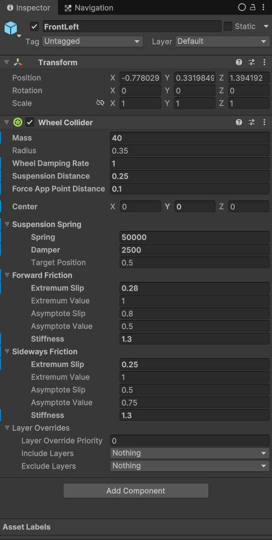 >> 游戏进展初步搭建了赛车系统,虽然操作手感还需要进一步打磨,但整体框架已经能够支撑起基础的赛车体验。在车辆模型方面,尝试了多种素材,发现很多模型在前后轮独立控制上存在局限,导致车辆动态表现不够真实。考虑到独立游戏的体量控制,应特别注意资源管理,避免过大的安装包。技术上采用了Unity内置的车轮碰撞器。这个组件提供了丰富的参数调节,包括侧向制动力、悬挂强度和前后轮摩擦力等,为车辆调校提供了很大