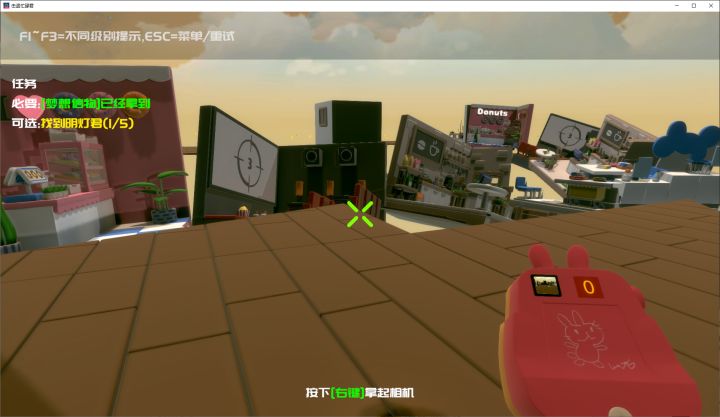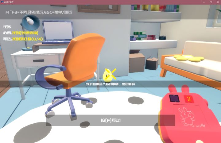 3D第一人称视角的寻物解谜游戏,找到明灯君和梦想信物,通往下一关的门才会打开。主要是梦想信物,明灯君可以不必全部找齐。独创了相机功能,可以将照片变成场景实物,有一定位置使用策略。新手引导相对简单,交互过程中界面也有提示文本,上手很容易。