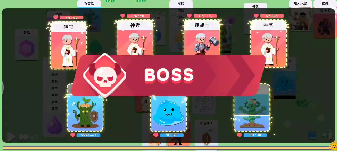 开局做任务的魔素留好先不要乱花, 看看商店买随从 树苗怪 (没有就刷新一次,只刷一次就够了。还没有就等第二天商店自动刷新),然后经验都给树苗怪吃(战斗开始时,怪物优先攻击等级经验最高的队友),拿加血装备给它撑血,史莱姆拿输出装备,其它全分解了。 继续刷商店攒够三张树苗怪合成树桩守卫(树桩守卫有挑衅技能,更稳)。然后就随便过了#
