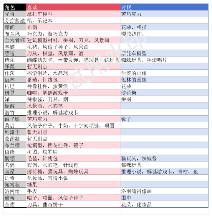 角色喜好表整理