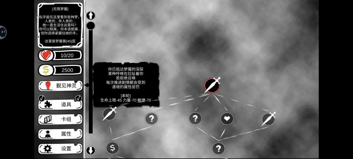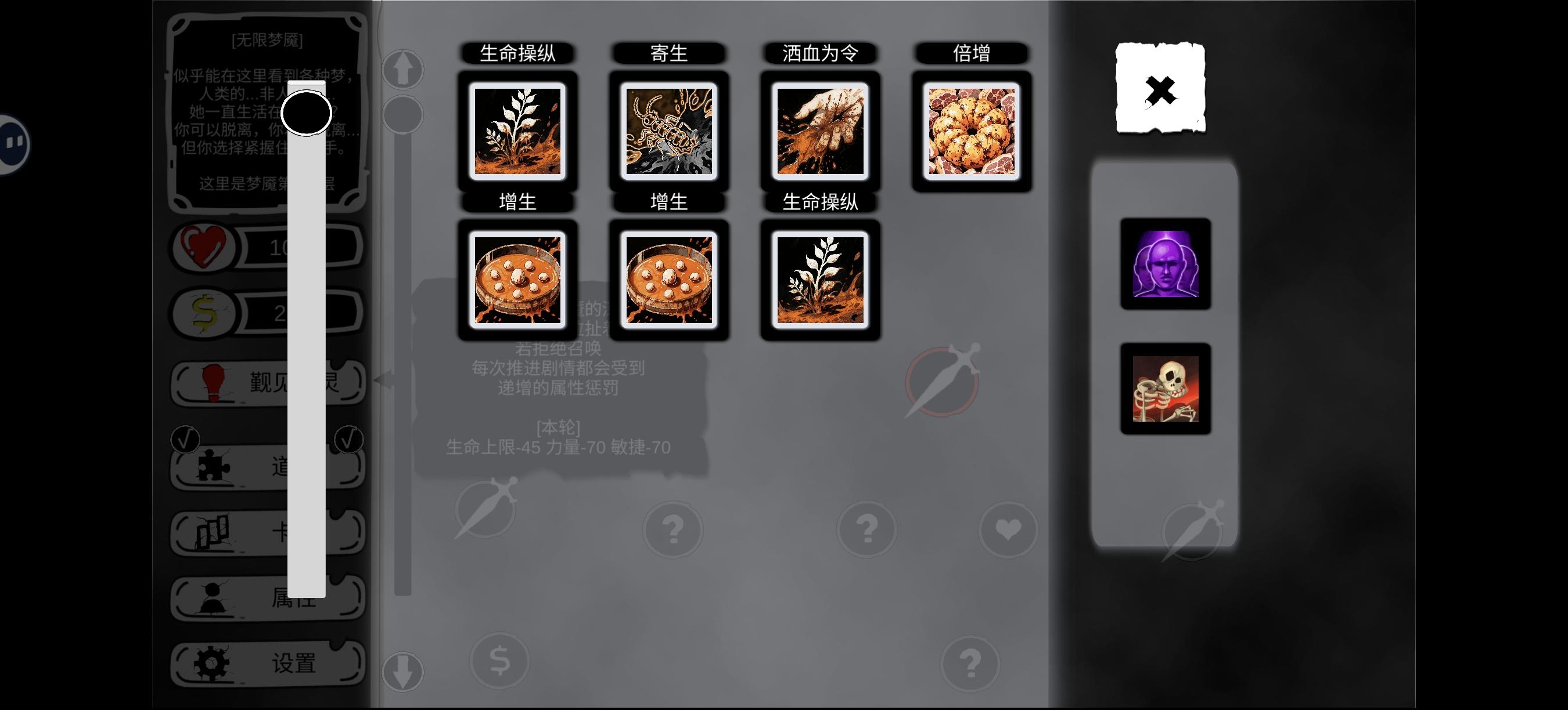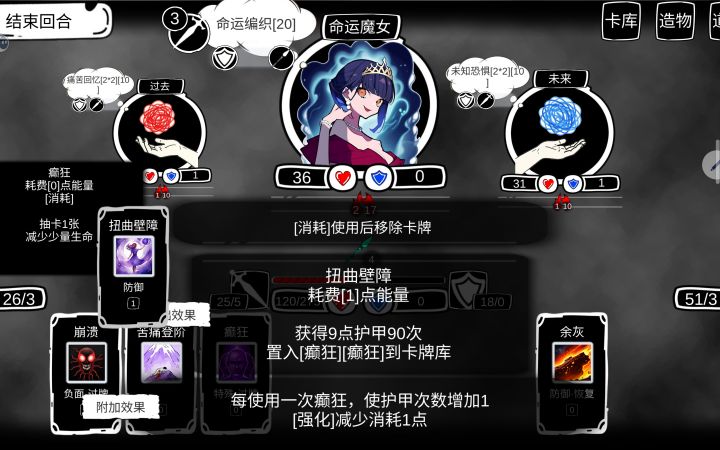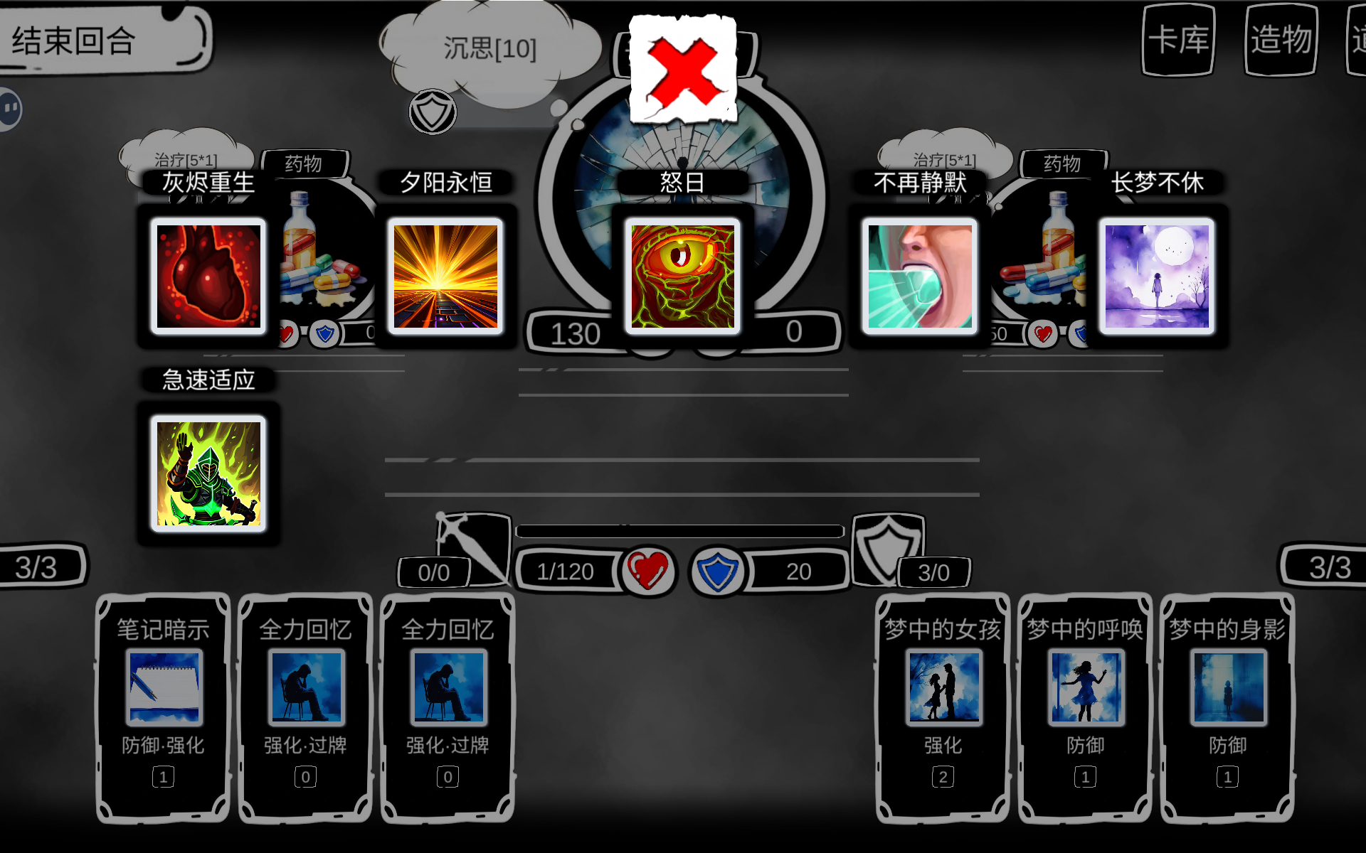 救救孩子,打不过了,被喂药喂到死,辛苦凹出来的用不了,剩84滴血,开局基础属性啥的基本没买,这里不买血和资源是打不了吗?纯萌新,机制啥的也能看懂,自言自语不能用,对面模糊的回忆攻击的时候就防御和刮,沉思的时候就猛猛输出,但无论如何都打不过,老是卡三张崩溃在手里,输出的时候会用掉抽卡,结果又抽到崩溃,太痛苦了,最后血还是不够用,太痛苦了。太幽默了,辛苦收集的卡组和造物都用不了,感觉不死个十几次叠