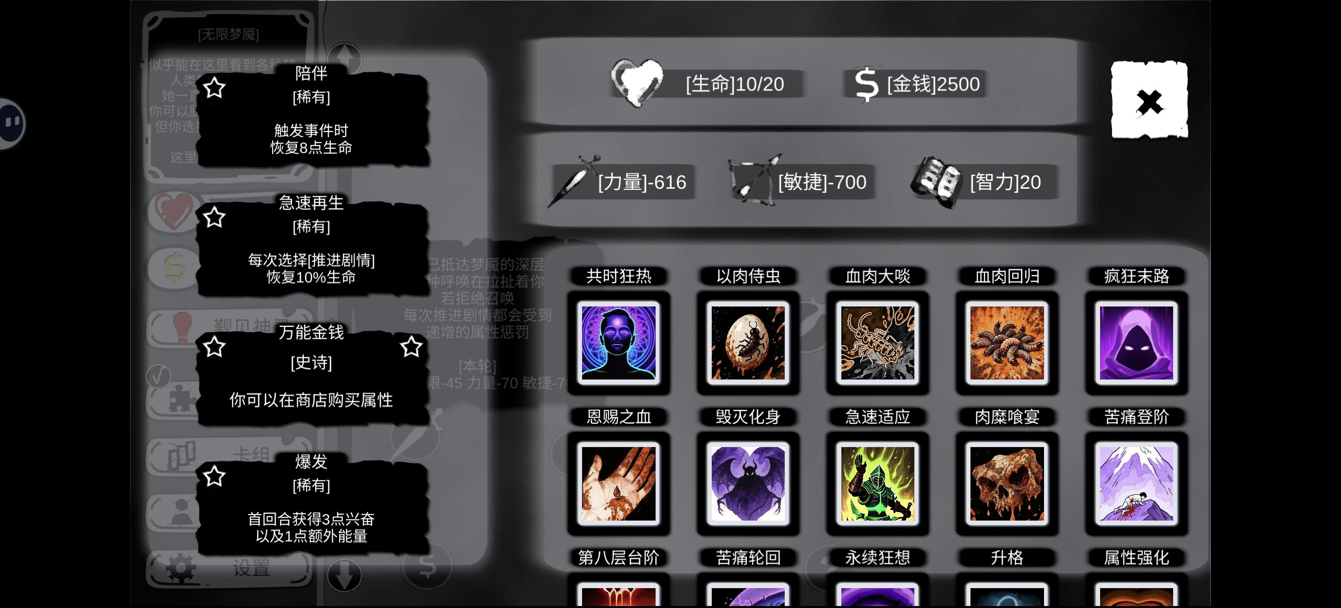 依旧是试验最喜欢的朽坏卡组,没刷血上限天赋,到45层大眼出牌扣血卡关了新版本的朽坏力量流由于展开过慢,续航过差,所以在压力局输出只能玩血蛆,血蛆的优势是不掉血肉,劣势是单次伤害比较低,所以用执念不休+倍增来进行多重倍增快速提高血蛆基础伤害,再用撒血为令增加攻击次数,在无尽中力敏转换可以无视负力量,再加上血蛆和狂想输出都不需要高力量,是无尽当中非常暴力的双输出组合