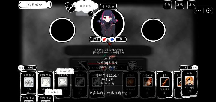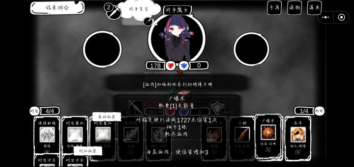 救救孩子,打不过了,被喂药喂到死,辛苦凹出来的用不了,剩84滴血,开局基础属性啥的基本没买,这里不买血和资源是打不了吗?纯萌新,机制啥的也能看懂,自言自语不能用,对面模糊的回忆攻击的时候就防御和刮,沉思的时候就猛猛输出,但无论如何都打不过,老是卡三张崩溃在手里,输出的时候会用掉抽卡,结果又抽到崩溃,太痛苦了,最后血还是不够用,太痛苦了。太幽默了,辛苦收集的卡组和造物都用不了,感觉不死个十几次叠