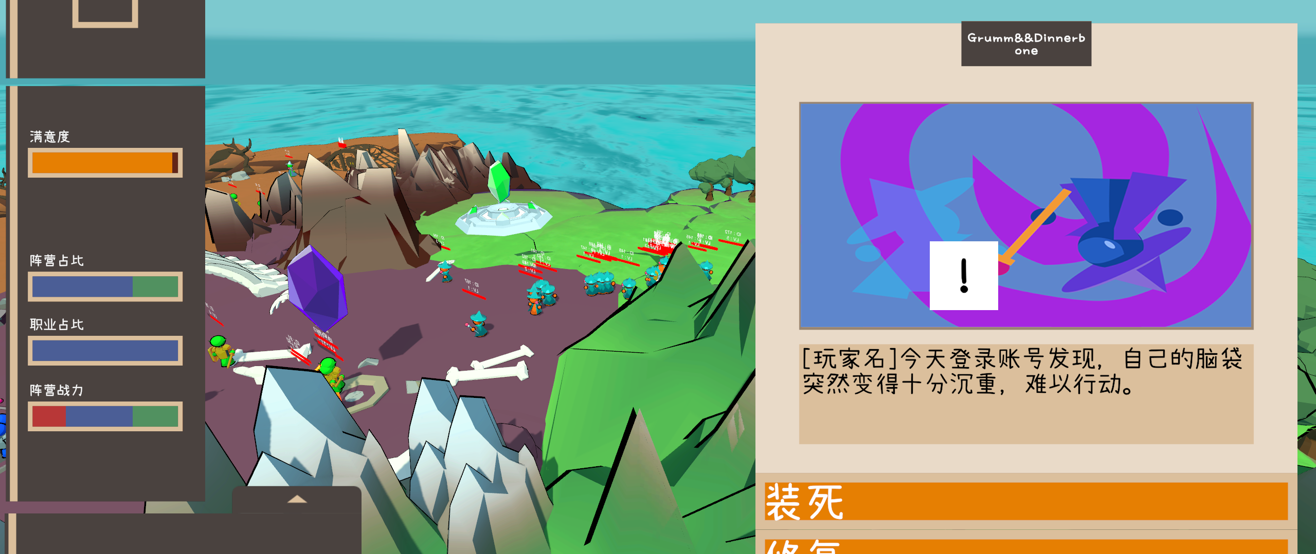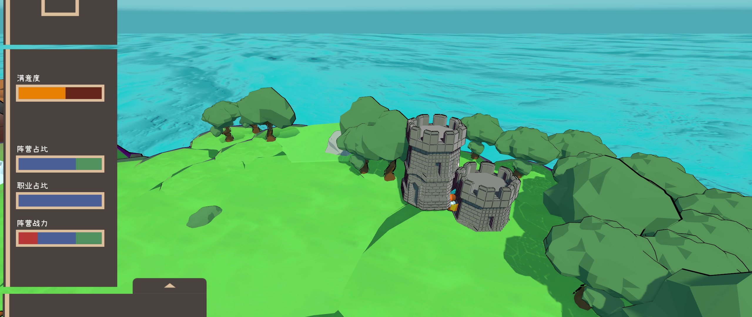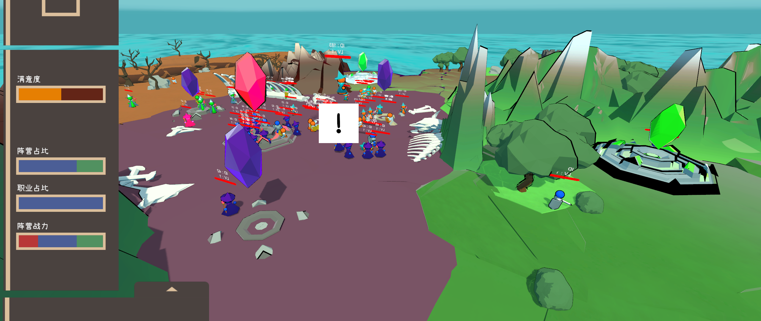 全3D建模,有些像lowpoly画风,场景和角色面数都比较少,同屏单位数量很多也不会卡顿。界面结构简单,功能逻辑清晰,UI大部分是色块,基本意思表达准确,不难理解。同屏单位玩家有自己的行为逻辑,遇到不同阵营会开始战斗,放置状态下有观赏性。
