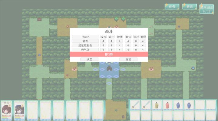 我们的游戏战斗系统已经开发完毕了。现在正在紧张测试中。游戏的技能类型分为近战,远程,治疗。玩家在选中对象后可以打开技能操作面板。上面会显示当前玩家可用的所有技能。当选中近战技能后,玩家当前操作的单位会移动到目标单位所在地块进行作战。若在战斗中击败敌人则会占领敌人所在地块。若没有击溃敌人,则会沿路径返回到第一个没有生物的地块。选中远程技能后玩家会对在射程范围内的敌人进行攻击。选中治疗技能后可以治疗