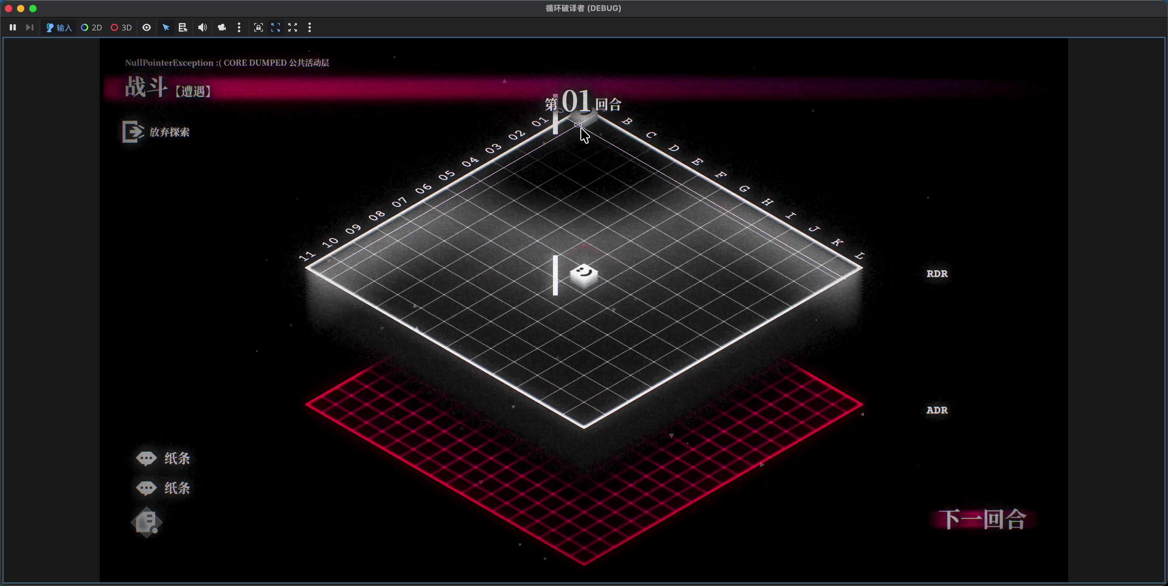 大家好,这里是《循环破译者》的二人开发团队这几天的工作重心完全围绕着核心玩法的实现。我们初步实现了核心玩法搭建战场环境: 我们首先实现了战斗场景的基础视觉效果,包括数据网格、图层透明度以及带有扫描线和噪点的CRT风格化滤镜,力求在第一时间就抓住我们在美术风格中所追求的“复古科幻”与“数据感”。创建单位与回合制: 紧接着,我们创建了游戏中的第一个友方单位(修复代码 hello_world)和