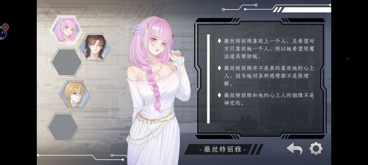 二次元画风,界面结构合理,UI品质较好,并有一定动态效果。角色立绘是静态的,凸显魔幻题材下的职业设定,性格特点比较突出,从对白文本中可以体现出来。