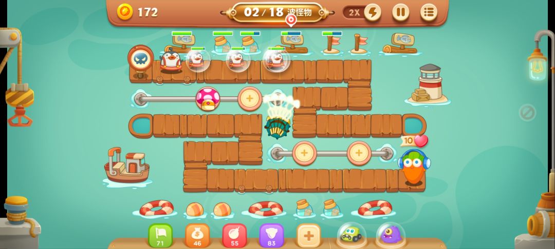 这个模式只能用裸衣萝卜,地图不能切换,只能刷新炮塔,直接开始挑战有不小的翻车隐患,这里稍微说下在下的心得。 1,不要吝啬战中道具,如果能离金萝卜更近的话。 2,每局成功后给的🎂数量只与萝卜血量有关,障碍清理不必强求。 3,很多时候刷新炮塔也是很有必要的,系统随机给的炮塔也许并不是最合适的。(1)这边推荐一些通关率高的输出炮台 有负电池基本稳了 (2)比较陷阱的炮台,打到后面输出就下滑严重,避坑指南