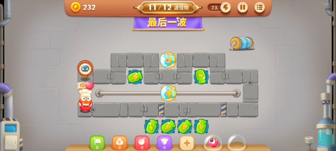 1、第一步:开局放一个瓶子和魔法球开始清理道具,第4波一定要把两排道具清理出来,期间有钱了就暂停升级炮塔。 2、第二步:两排道具全部满级之后就如下图在上面一排放5个大便。 3、第三步:之后有钱了就继续在下面一排放魔法球,就可以通关了。 原帖