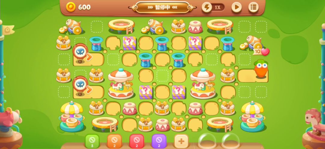 这段重温3代,波波没赶上只打了2天就结束了,还好有个游乐场,送大量抽奖券,目前吉吉刷到50级了(我之前关卡用的还是没满级的飞机和小丑),还剩七百多角色券暂时懒得点,建议应该加个十连抽,单个抽奖太墨迹了 游乐场全打完,感觉第三关最好刷,全程2倍速无需暂停,气球全打,第一波气球最好手喵打掉,不想点可以提前造个导弹,后面全自动就行,操作只用清清道具造造炮塔,我的布局只是为了对称好看,无需原样照搬,可以随意布置,这关难度很低 关于盒子,惊喜盒子也就清道具快点,其实无卵用,最好的是惊吓盒子,打完给券,一个惊吓相当于打一波气球