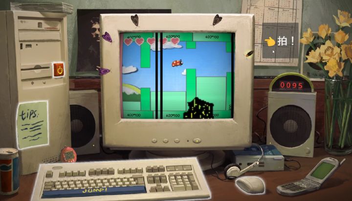 我们游戏的主界面资源到货啦!替换了资源后的游戏画面非常地有质感给大家介绍一下与美术设计沟通的一些想法画面主要以操作电脑的第一视角为主要视角,设定的时间年代大概是八九十年代,所以整体画面会往复古风走,电脑、摆设以及背景的部分都参考了当时会出现的一些物件以及成员们想要放入的一些东西小飞虫的资源还在制作中,目前只有一个类型的,设定上会随机出现不同样子的小飞虫小游