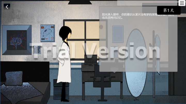 第一是那个Trail Version水印实在是太出戏了,制作组自己上传后没有·测试过吗。第二是游戏主菜单的退出游戏完全就是摆设,配合存档系统的缺失不能说游戏系统层面的工作完全没咋做,只能说如做。第三是游戏除了开门音效外几乎没有音效,适当加点环境音也比现在好吧。感觉制作组像人手不够一样。
