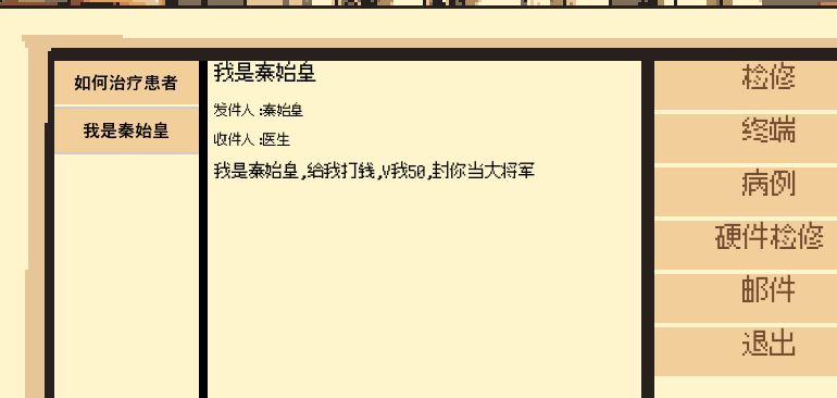 今天周末,疯玩了一天发现什么也没做,于是紧急更新中…… 增加了一些NPC的立绘,然后写了他们的随机出现,以及更新立绘,在预想的流程中,每天会有接待一定数量预约的病人,有时候也会遇到没有预约的病人,或者主线任务之类的突发情况,这是推进剧情的一个重要手段。