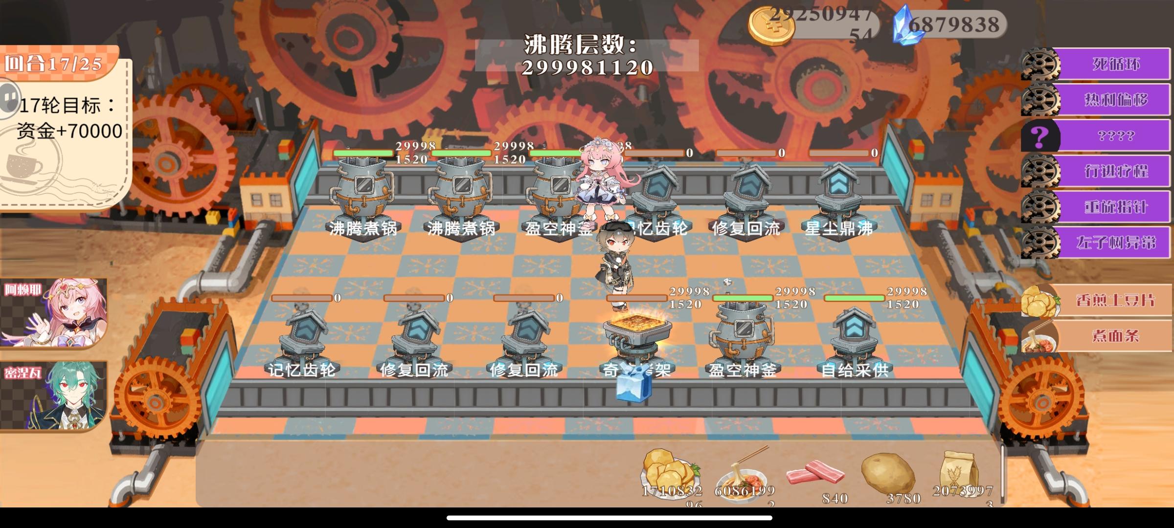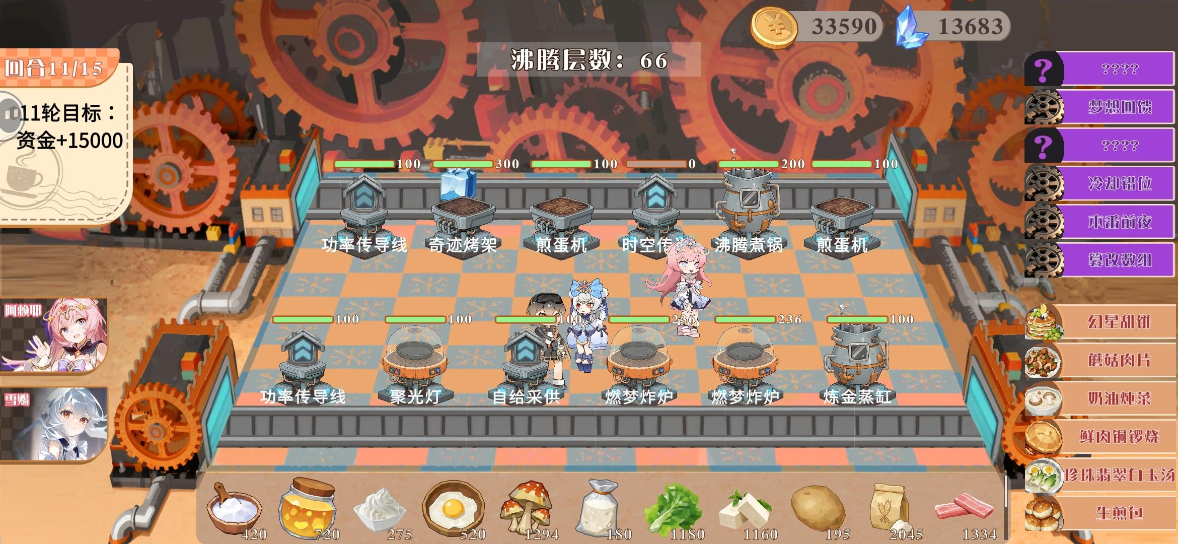 整个游戏过程很长 中途黑屏 卡住 或者一个操作小失误就会丢失全部进度 哪怕出一个自动保存上一关的功能呢 也不至于玩了半天前功尽弃 因为现在经常黑屏啥的 没有存档功能真的特别影响体验此外,想加一个能预览开始销售后能获得的金币和食材消耗情况,同样回合结束后也可以有一个消耗了多少食材,金币获取明细的小结,方便制定下回合的策略