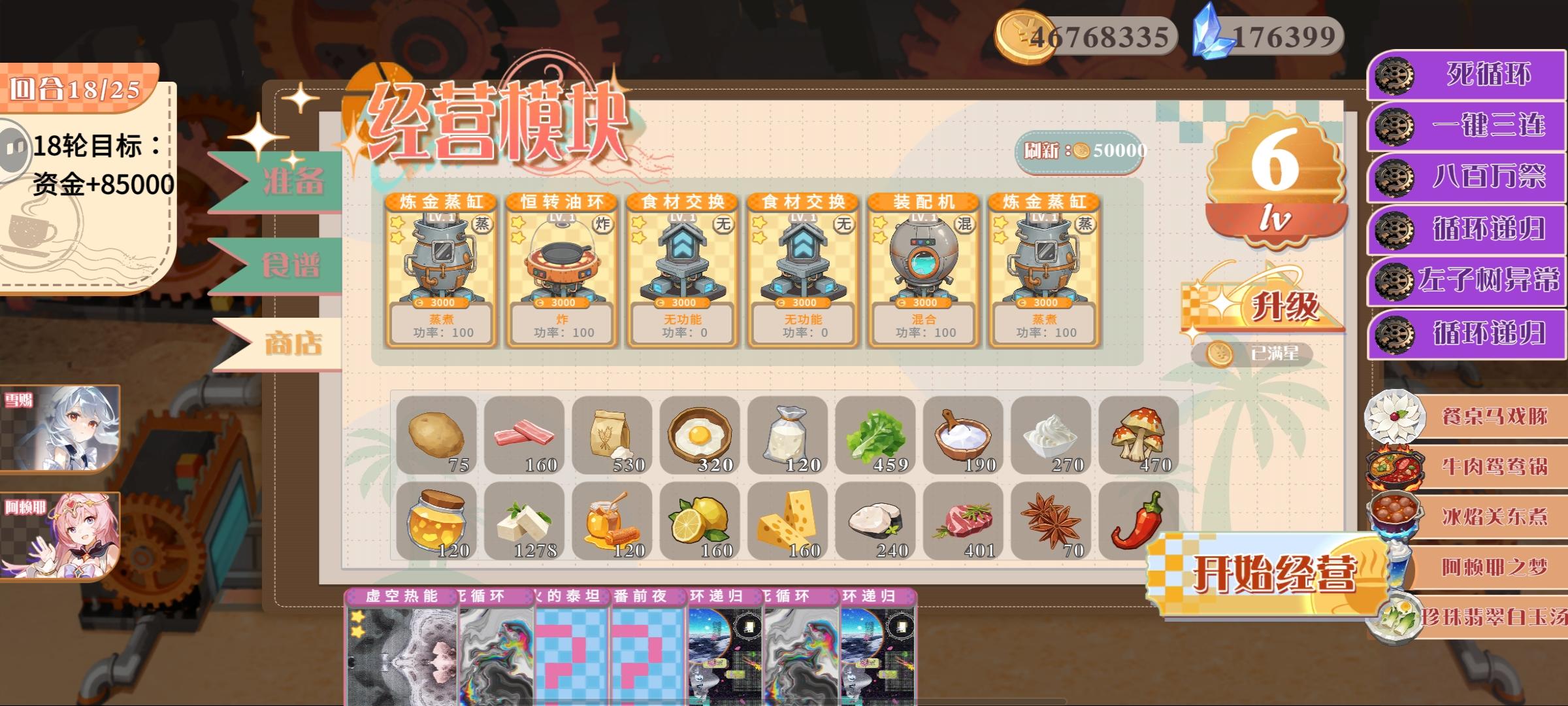 本游戏是一款卡牌+烹饪结合的策略经营自走棋游戏。游戏的主要玩法是通过在经营阶段购买食材、食谱和产线机器,将食谱和机器合理配置,从而在生产阶段自动制成成品预制菜盈利。【商店与食材页】在此页你可以购买各种类型的卡牌,其中食材卡购买后食材会直接进入商店区下方的食材库;产线卡、食谱卡、Bug卡均可直接购买拖入下方手牌区。升级商店可以使更高星级的卡牌被刷出。【食谱与bug页】在此页你可以将食谱卡和