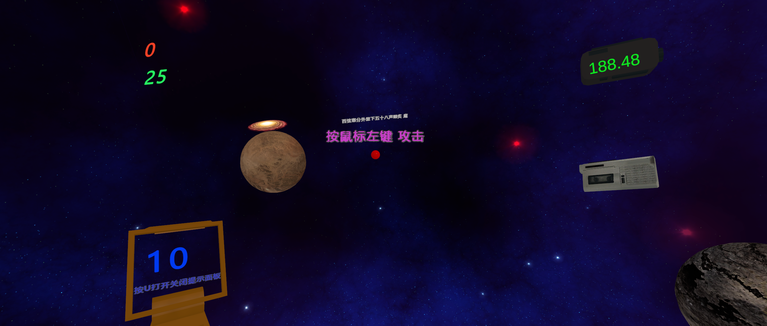3D空间建模,场景给人的视觉纵深很好,空间立体感强,可以感受到宇宙的广阔无垠,也能看到游戏场景的相对边界。看不到自身是什么模样,只能看到丢出去的陨石特效,战斗表现很普通,没什么看点和打击感。可以打开音乐,一边听音乐一边赶路,体验到也还行。