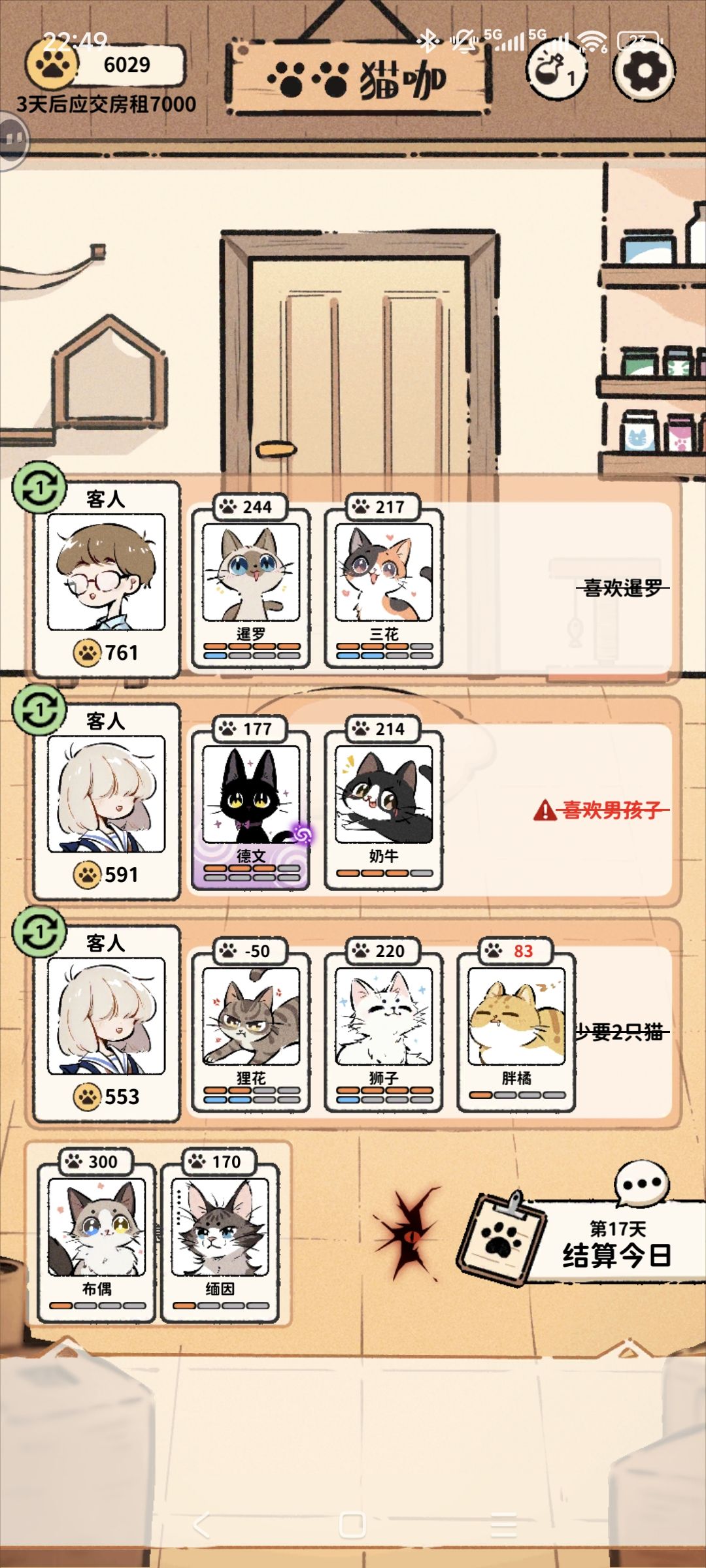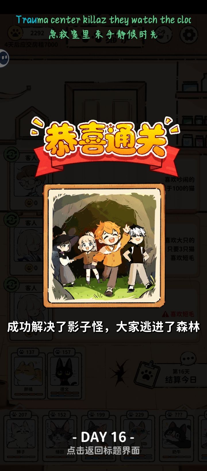 第四天三花丢了(失误) 只要运营好精力,其实挺简单的,不要省钱,你没有德文就是瞎子,万一开局规则贴脸,莫名其妙就会丢猫 抽两次必出德文,下一天就可以看里世界了 里世界可以看探索进度,进度快满了就要控制猫的精力值,方便判断哪个是影子怪(影子怪附身的猫会一直满精力)如果你没有找出来用德文解决,德文就会失踪然后坏结局(第一次被这个翻车了) 先把梨花清醒,如果清醒暹罗(如果能先拿到缅因就给缅因,这样子可以