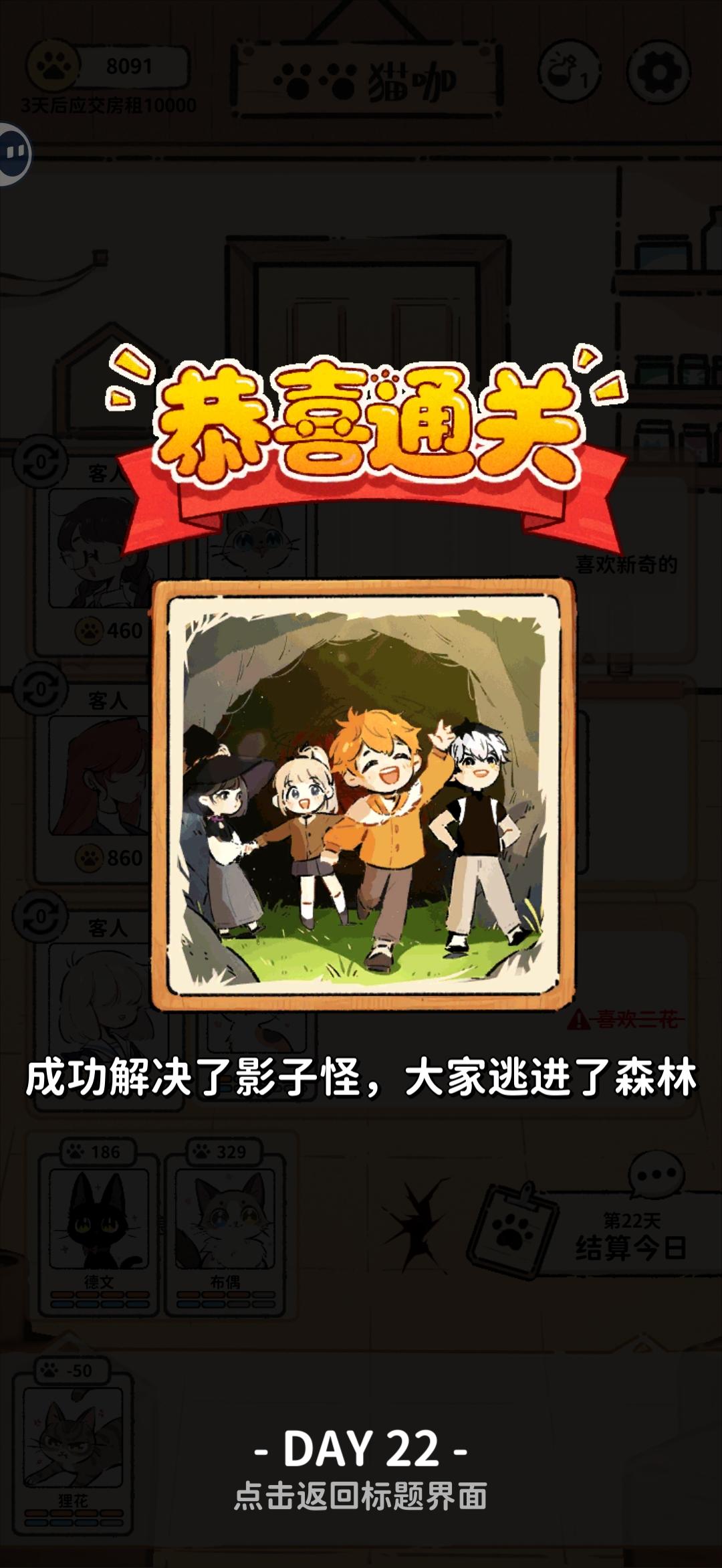 捉影子鬼的时候判断失误,失踪了一只猫,第二把成功,通关