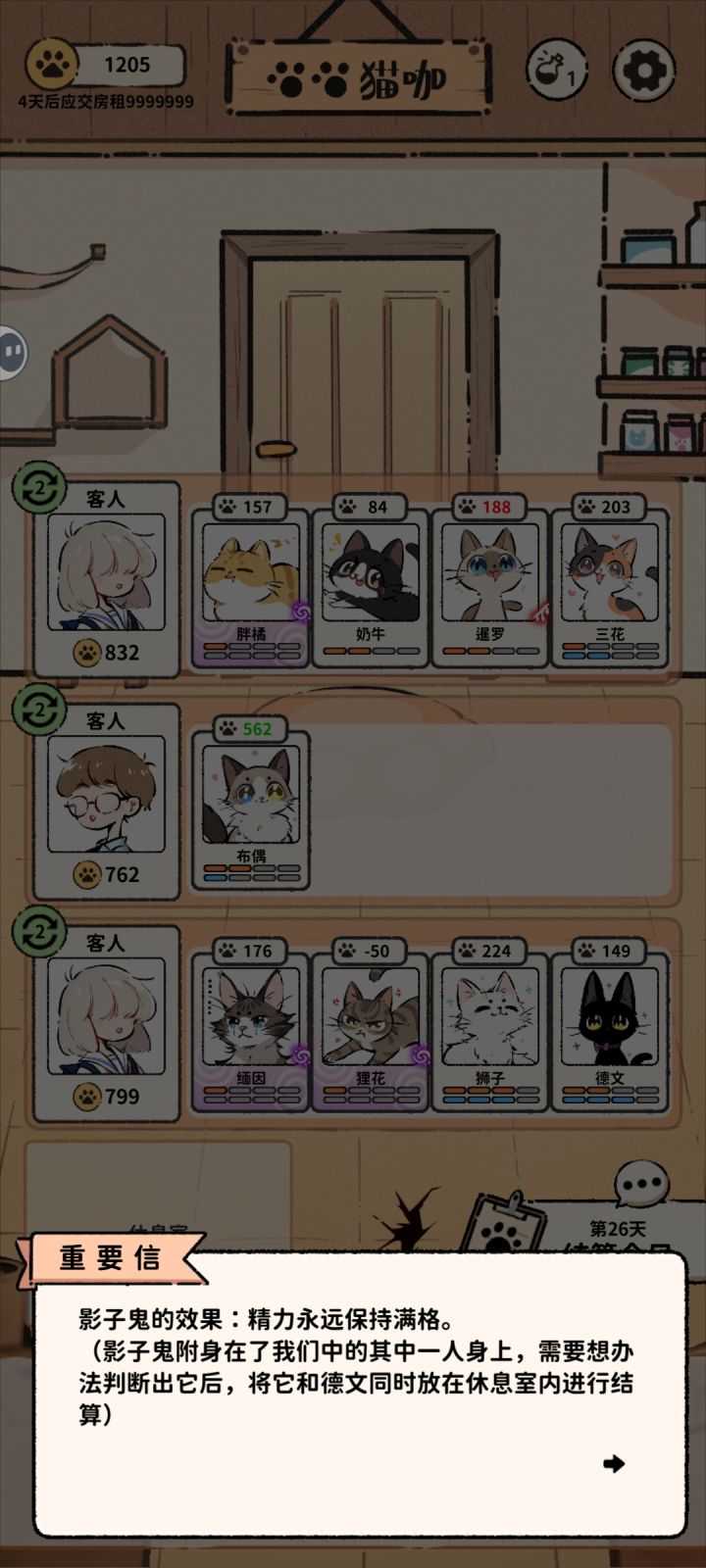 1.第一次去里世界后,点屏幕中下方那个孔,可以切换表里世界,更好地拟订安排2.奶牛猫每天,每个位置价位不同,追求极限的可以考虑明天1234的位置都让他呆一下看看3.每个顾客,有猫+200金,黑色任务完成+100金/个,红色任务完成+0,失败*0。2和3可以作为是否增减猫的考量点4.钱是没有意义的,留着不能产生任何价值,所以游戏前期目标就是交租日不炸的情况下,尽可能早地花钱买猫……而买完猫以