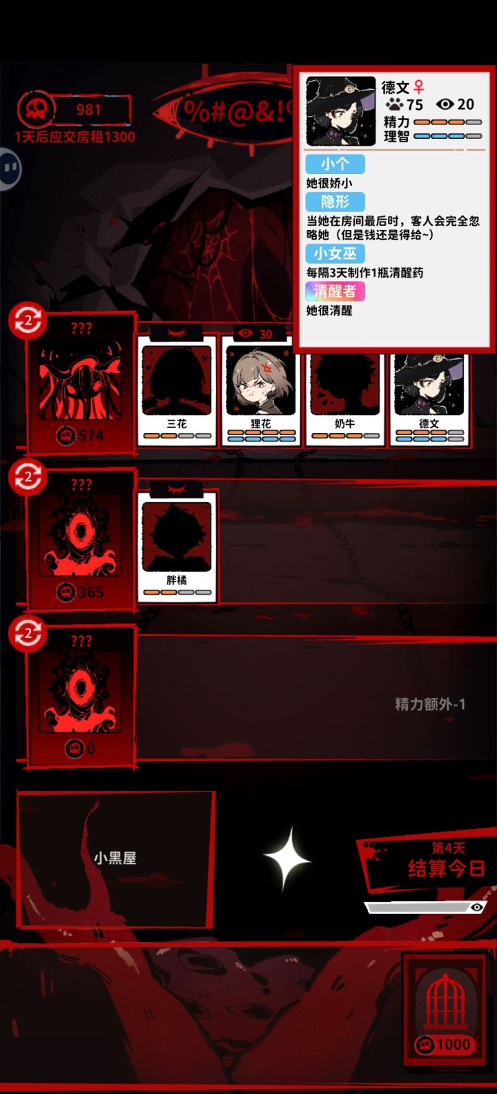 因为解决影子怪的前几天 我的医生白猫已经重伤 不放在休息室100%会死 我纠结了3天了 另外精力满格得从第二天开始看 不是当天 我搞错了2天这个感觉还能再出系列呢 期待更新
