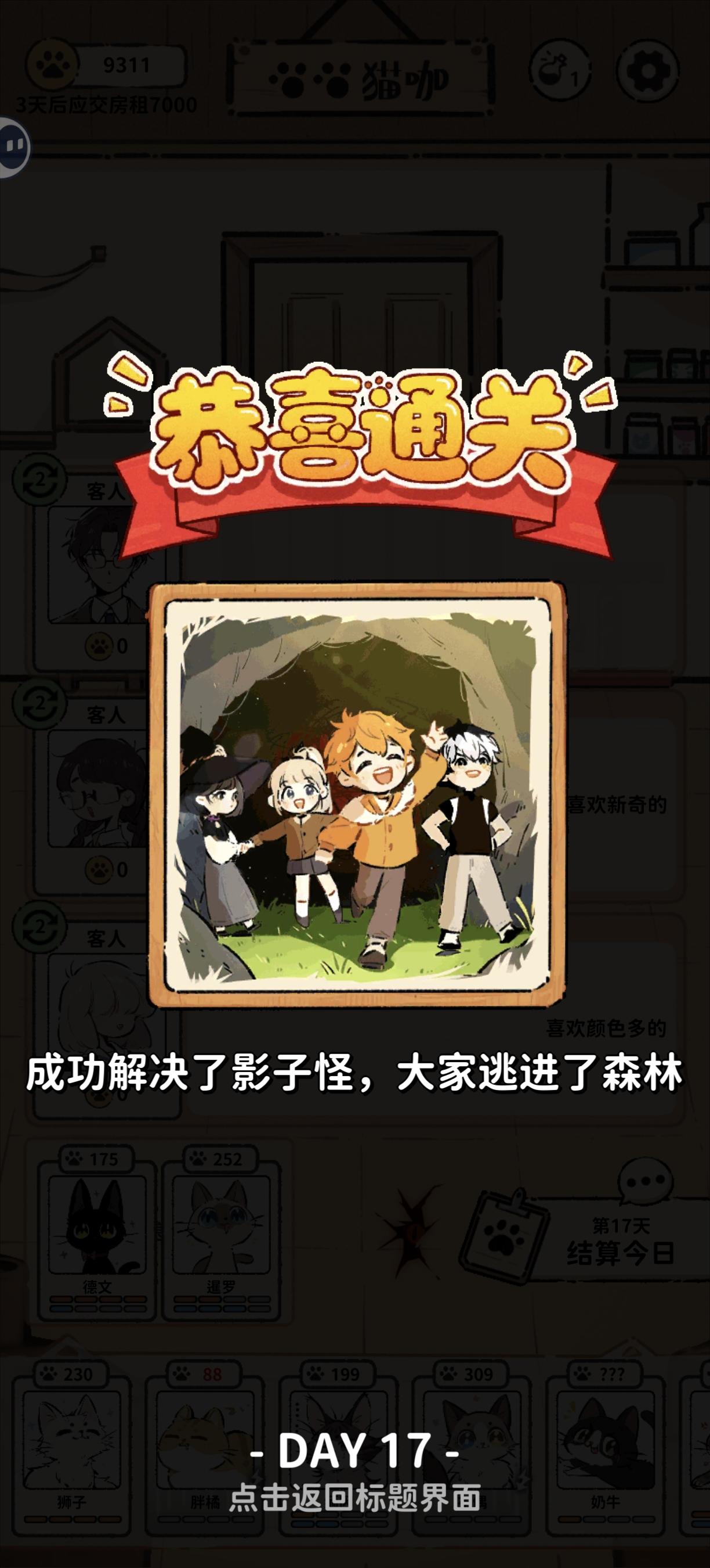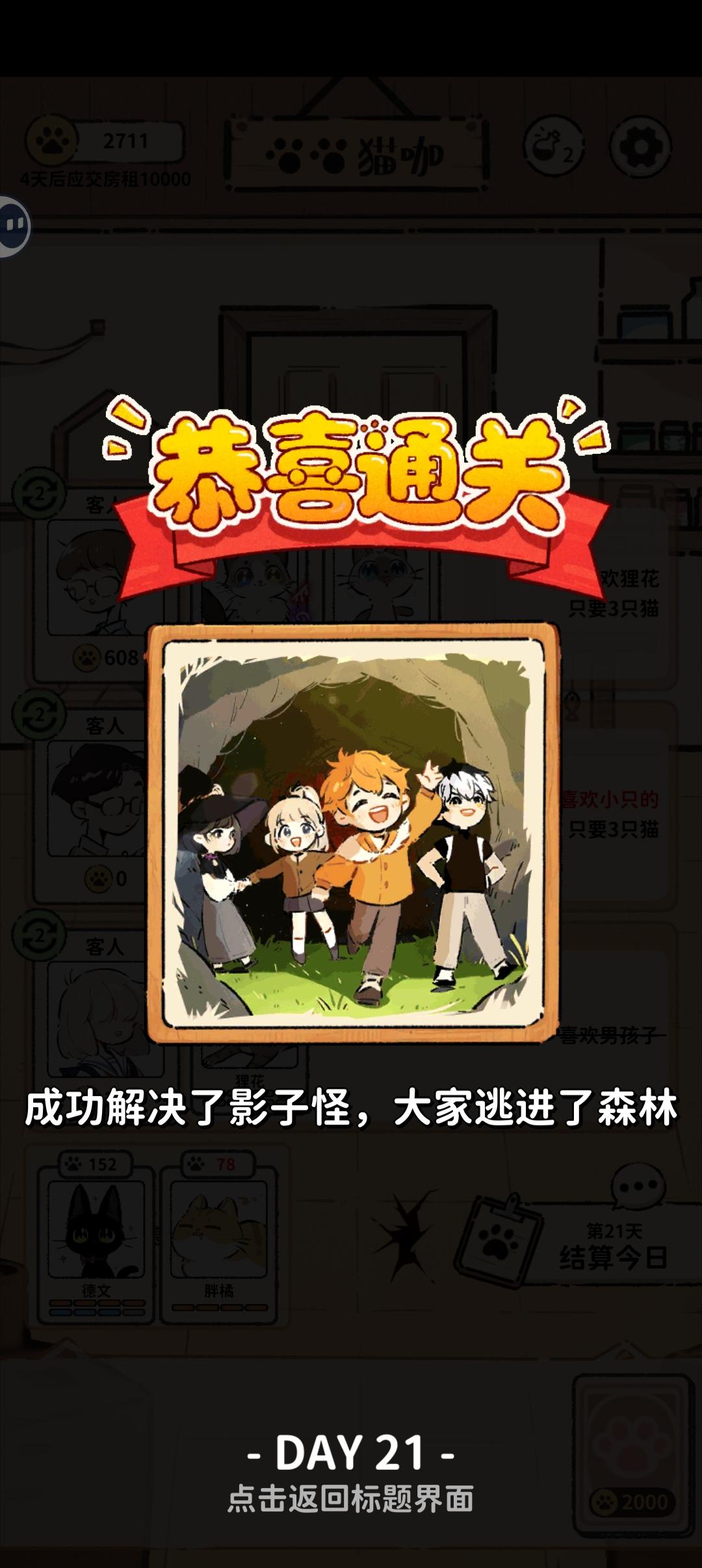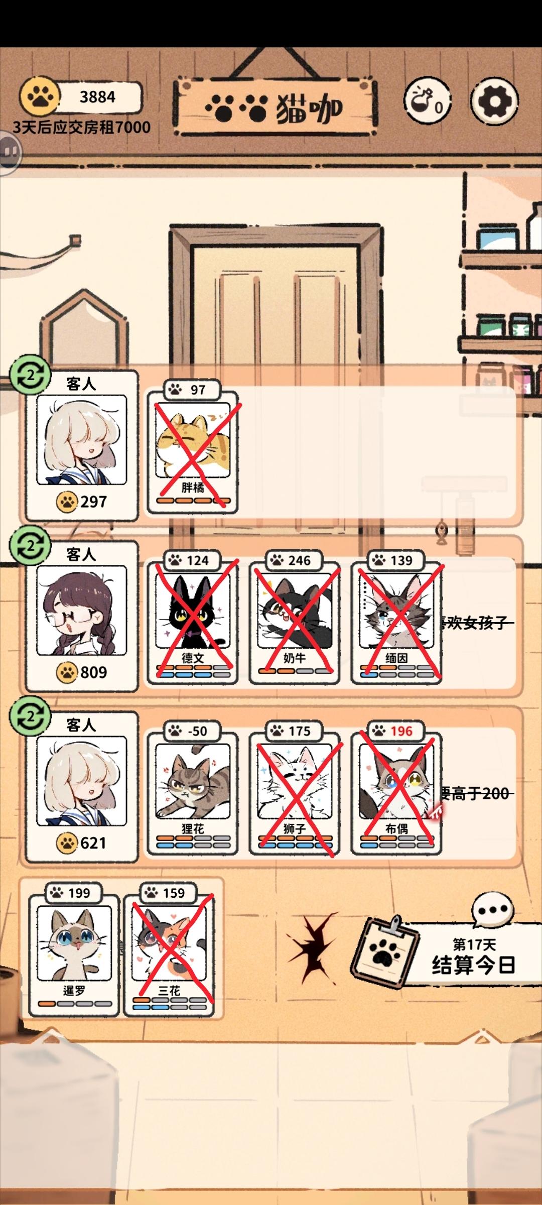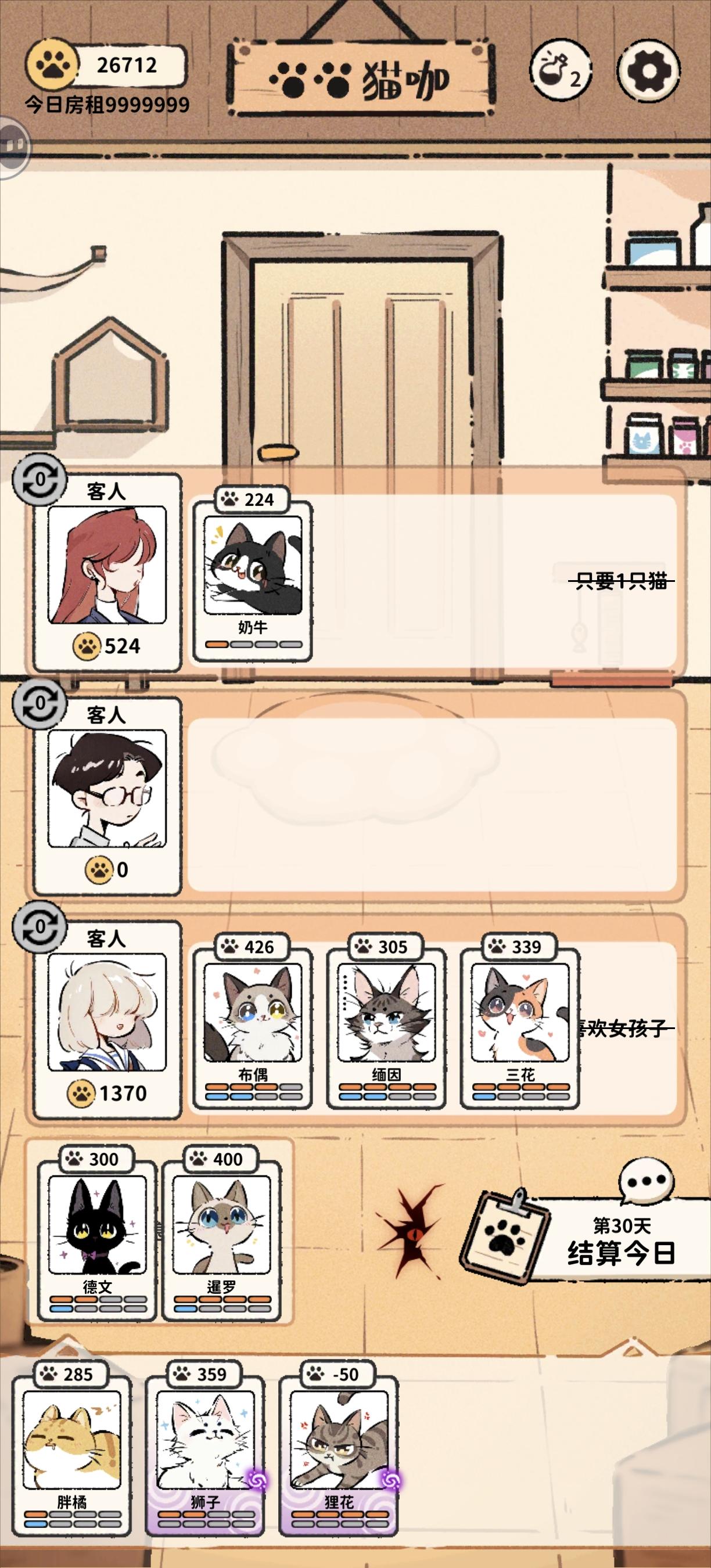 终于过了,精力是黄条,理智是蓝条,看谁接客不掉黄条就是影子鬼,最后用排除法锁定了暹罗和狸花,把她俩和德文关一起最后影子鬼是狸花,前期第一天橘猫加三花500第二天买奶牛尽量在第三天凑出德文就很好过,别让猫猫独处,胖橘营业额不高可以让胖橘陪在家的猫猫或者休息室的猫猫,只要位置对奶牛猫中后期营业额不低,前期我先开的狸花,狮子,布偶清醒,布偶和狸花可以尽早开清醒,布偶赚钱快,狸花无脑满足第一个要求在加上营
