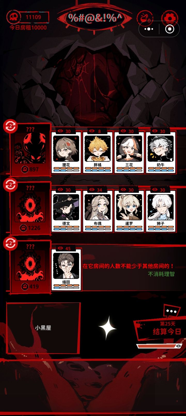 第一把没搞懂怎么玩,连续失踪了三只猫咪,我直接坐不住,从头重新开了一把,以后瞬间搞懂机制,要不是影子鬼描述有问题,我估计早就结束了,还是瞎猫碰见死耗子,24天结束了不知道因为什么原因,缅猫没了,没一个针对他的词条,行动跟着大部队,4只猫中他失踪了,我至今没搞懂失因是什么