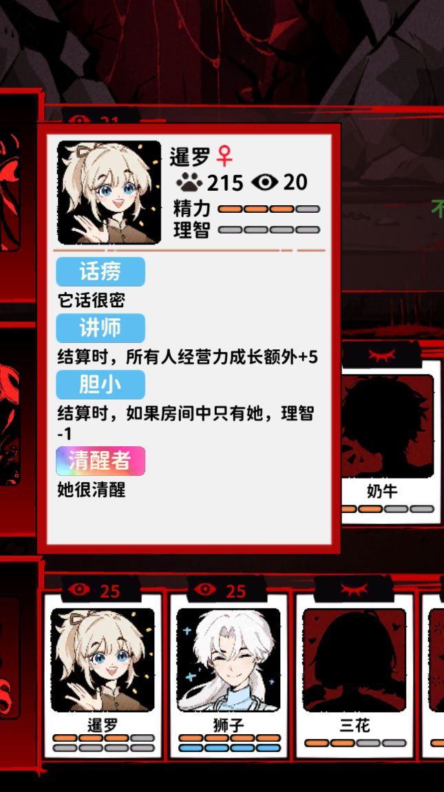 看见有人说容易失踪,遂发了这个,让你丢弃大脑,全员通关流程:开局:随便用刷新,争取第二天拿到德文,而后第三天游戏正式开始步骤1.用药顺序:狸花→暹罗→布偶→狮子→无(此时大概率通关)步骤2.刷新:点进怪区,见到红就刷,没红不刷了步骤3.放猫:不用管猫咖的一切,看见“经营力+2”直接把狸花放第一个,然后暹罗布偶德文都放上,布偶无论有没有收益都必须每四天上满三天,然后她醒了之后就可以单