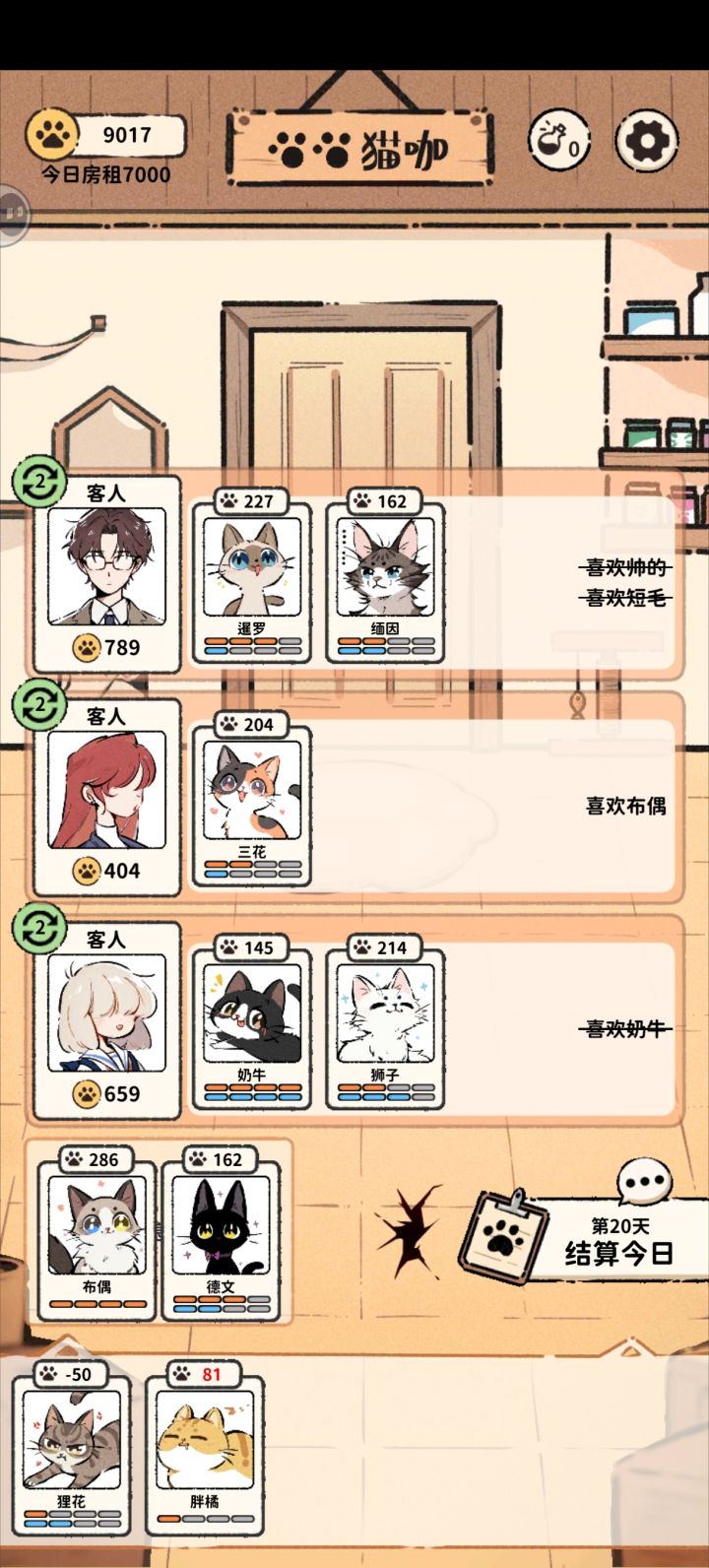 看见有人说容易失踪,遂发了这个,让你丢弃大脑,全员通关流程:开局:随便用刷新,争取第二天拿到德文,而后第三天游戏正式开始步骤1.用药顺序:狸花→暹罗→布偶→狮子→无(此时大概率通关)步骤2.刷新:点进怪区,见到红就刷,没红不刷了步骤3.放猫:不用管猫咖的一切,看见“经营力+2”直接把狸花放第一个,然后暹罗布偶德文都放上,布偶无论有没有收益都必须每四天上满三天,然后她醒了之后就可以单