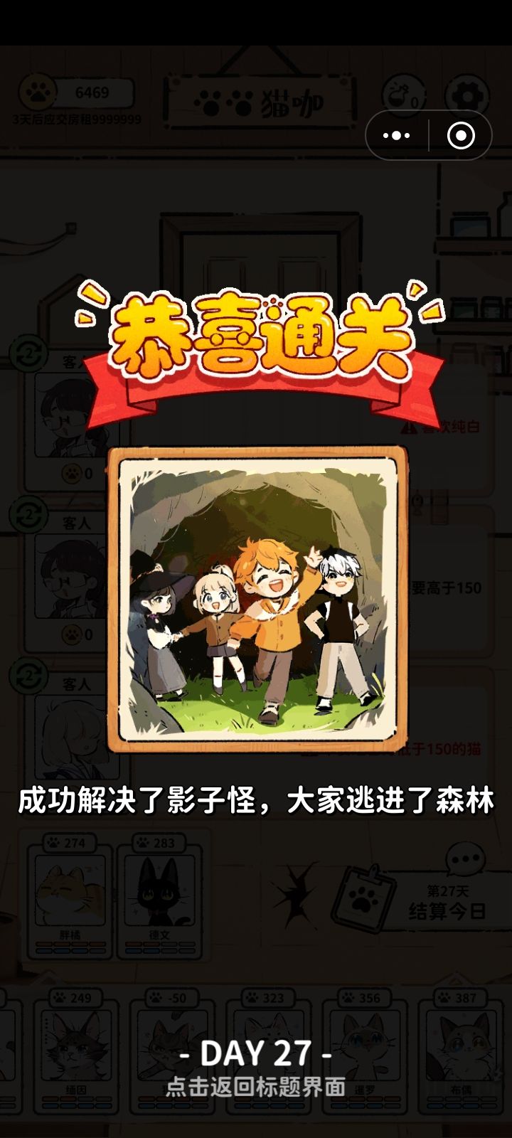 上午失败了几次,每次都是开始没多久我的猫猫就失踪了。下午琢磨着突然明白了怎么玩(原来是我没有看明白规则),然后就一次通关啦(✿ฺ-ω-)影子鬼出现的时候恰好是附身在一只已经没有体力的猫上,猫猫满血体力条跟疲惫状态是矛盾的,所以立马就被我识破啦