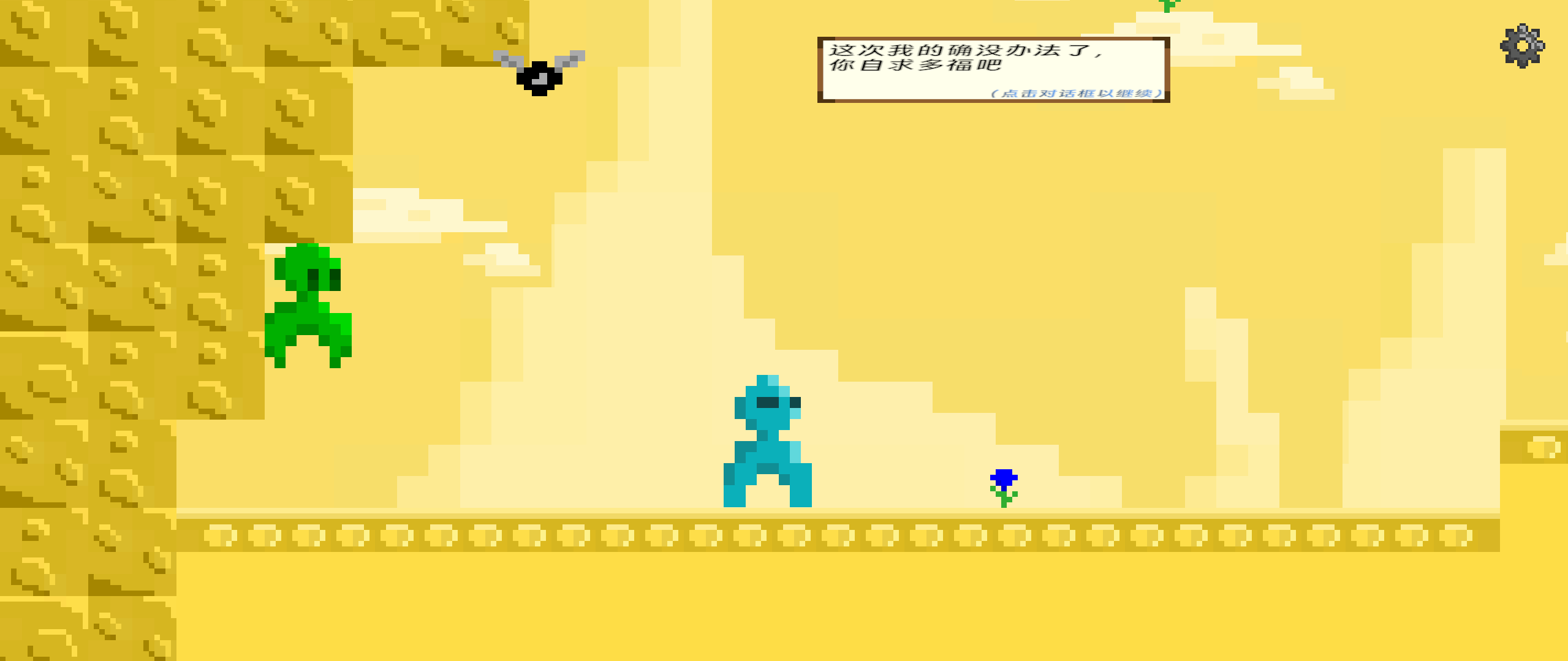 2D像素风,界面结构简单,有限的几个UI并不多。场景突出不同区域的主题特点,特效简陋了点,不过意思表达很准确,看美术资源就能猜到规则如何。角色造型比较特别,主人公看起来像外星人,小黑球也不知道是什么生物,时而呱噪时而静默,还带几句调侃,印象颇深。