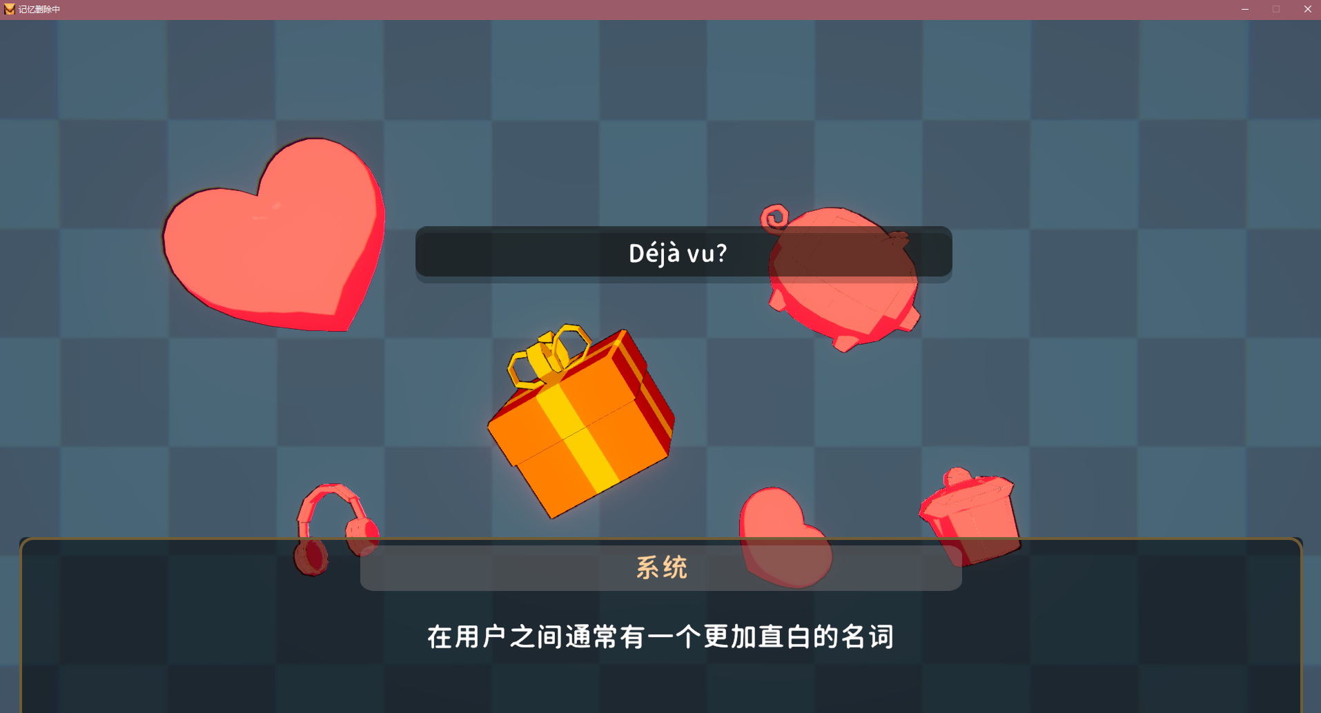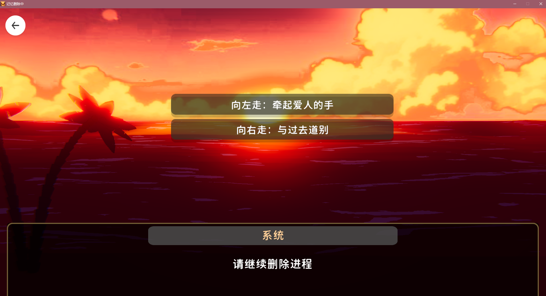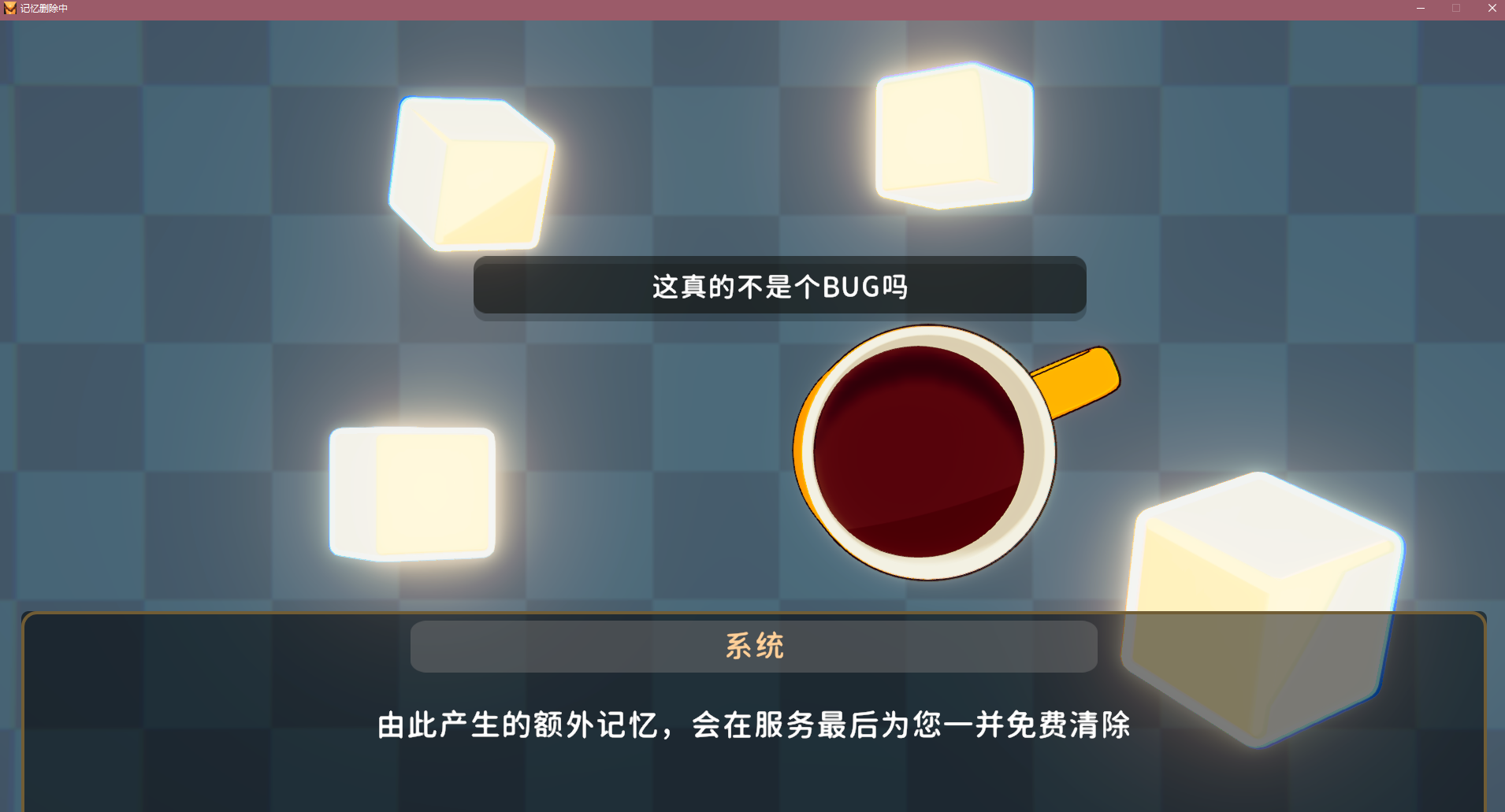 文字冒险类游戏,模拟进行记忆删除的过程。男主因与女主分开而导致痛苦,从而选择记忆删除,整个过程都有“系统”这个角色参与,与玩家的互动对白有点像捧哏的效果,有些选项和对话让人看了忍俊不禁。纯文字游戏无需介绍操作,点击下一句话,有简单的选项,基本不怎么影响结局。