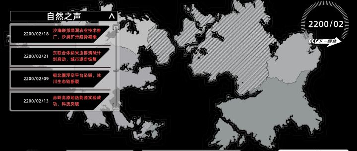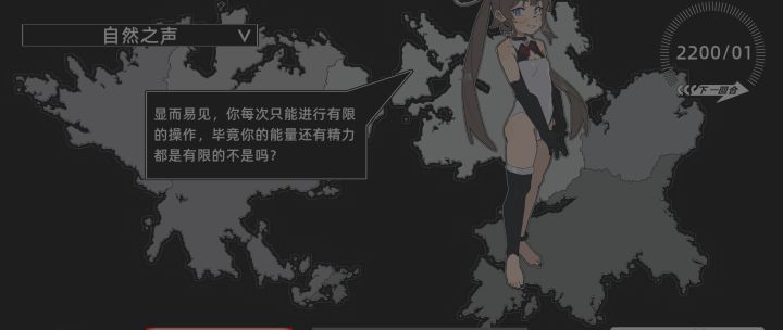 2D黑白画风为主,界面结构很简单,UI品质一般,能表达出基本意图。角色形象最初只有一位美眉新手引导员,不确定是否还有其他角色,游戏也是以第一人称进行的,有一种玩SLG游戏的既视感。自然之声内只有文本内容,重要字体有标红处理,人类事件有配图,便于理解和认知。