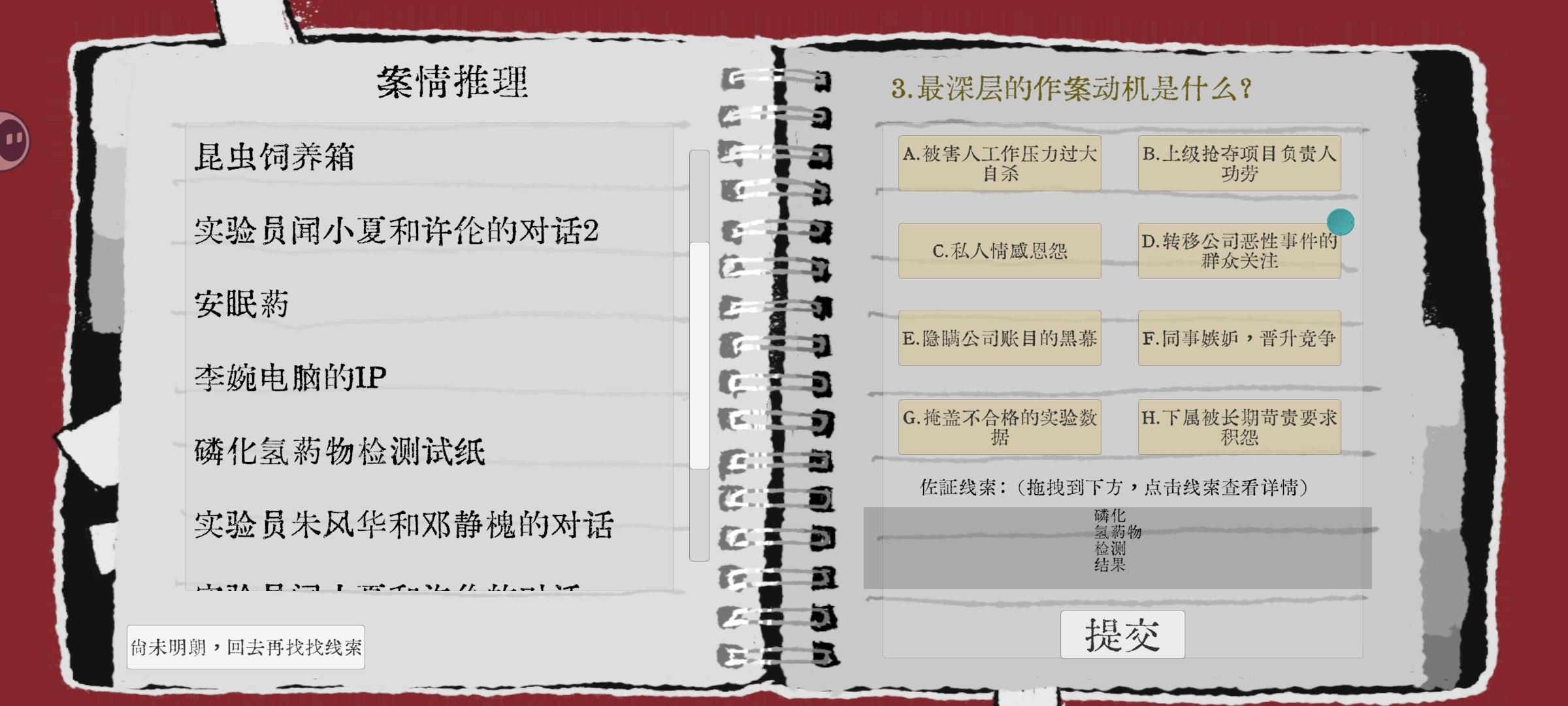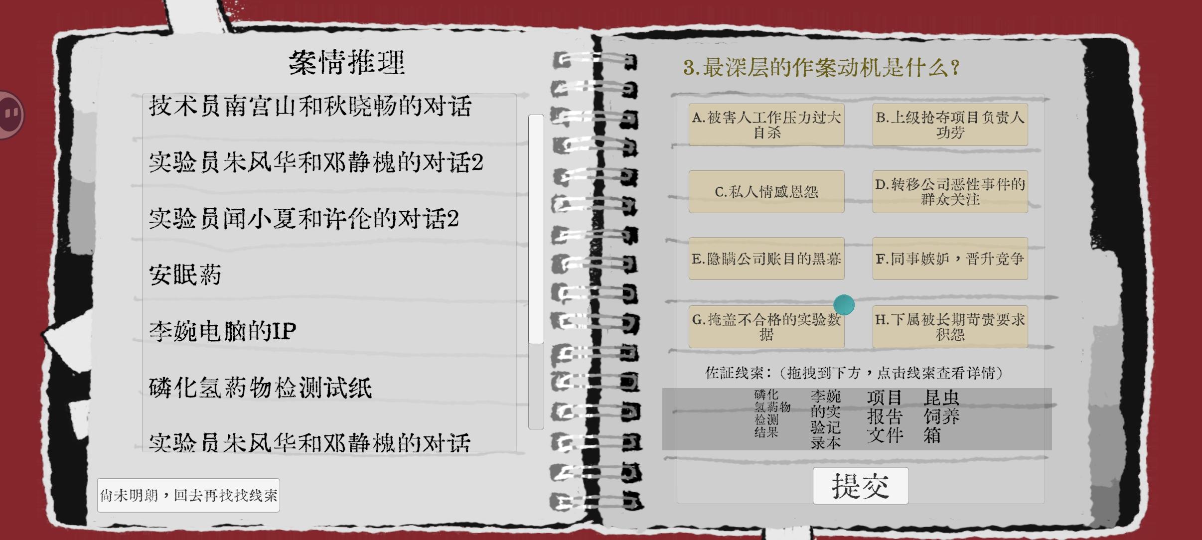 官方陆小妖 : 非常感谢你的肯定!线索确实会影响最后结果,没有严格一个不落,但多选或漏选太多都可能导致推理不成功。但在如何平衡自由沉浸感和游戏难度上,可能还需要更多打磨。再次感谢你的反馈~不妨再整理整理思路,缜密的推理链条更能锁定真凶、让众人信服呢~